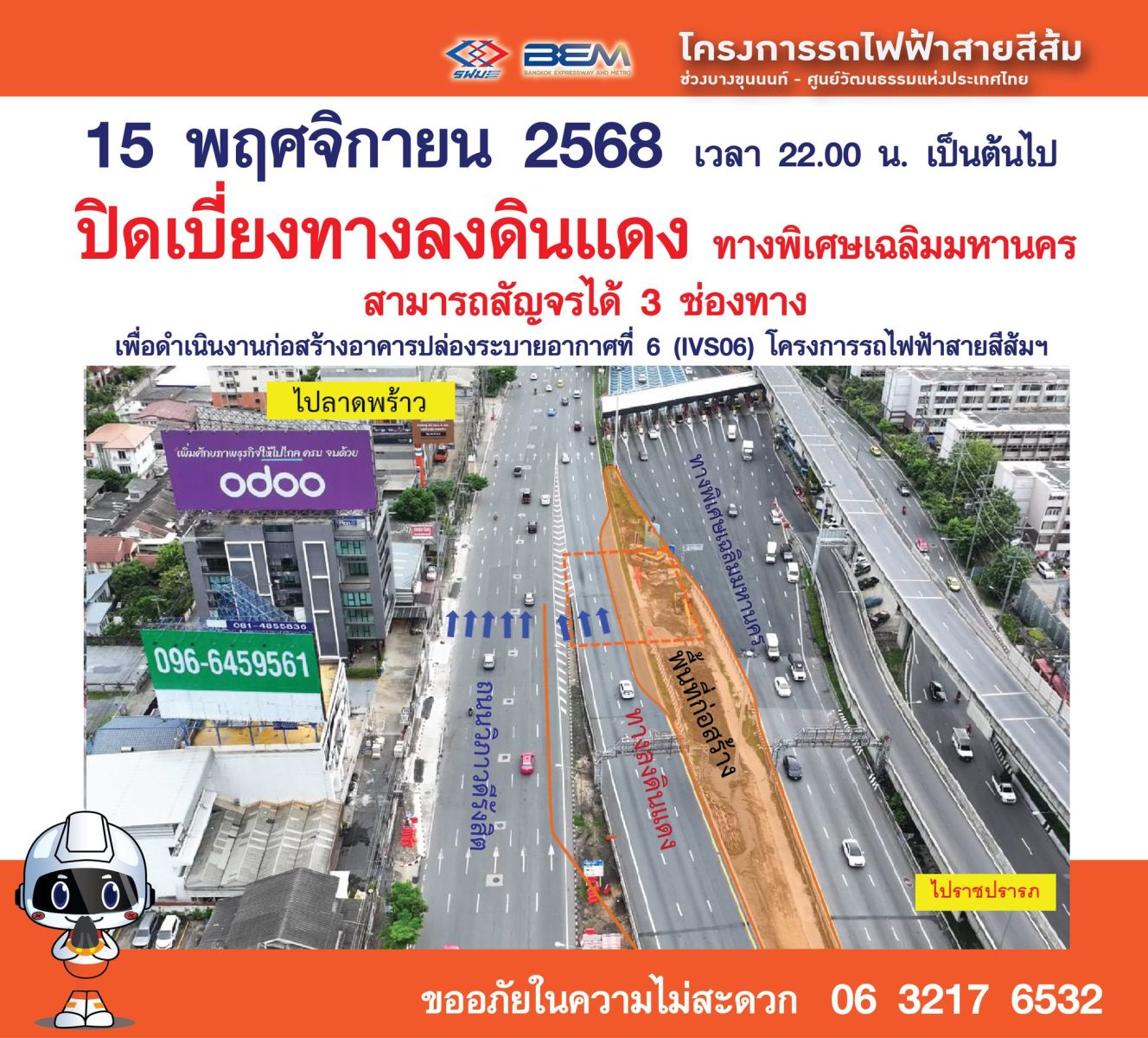 ประชาสัมพันธ์ โครงการรถไฟฟ้าสายสีส้ม ช่วงบางขุนนนท์ – ศูนย์วัฒนธรรมแห่งประเทศไทย แจ้งปิดเบี่ยงทางลงดินแดงทางพิเศษเฉลิมมหานคร ตั้งแต่วันที่ 15 พฤศจิกายน 2568 เวลา 22.00 น. เป็นต้นไป เพื่อดำเนินงานก่อสร้างอาคารปล่องระบายอากาศที่ 6 (IVS06) โครงการรถไฟฟ้าสายสีส้ม มีผลให้บริเวณทางลงทางด่วนดินแดง สามารถสัญจรได้ 3 ช่องจราจร