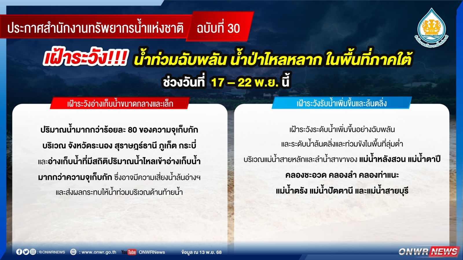 สทนช. ประกาศเฝ้าระวัง “น้ำท่วมฉับพลัน - น้ำป่าไหลหลาก” ในพื้นที่ภาคใต้ 17 – 22 พ.ย. นี้