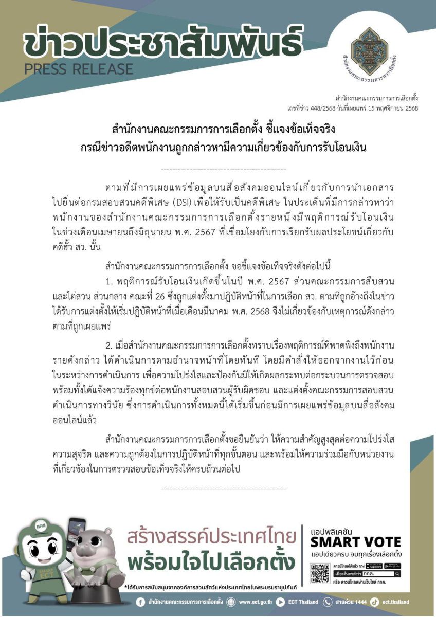 วันที่ 15 พฤศจิกายน 2568 สำนักงานคณะกรรมการการเลือกตั้ง (กกต.) ได้ออกเอกสารชี้แจงกรณีที่มีการเผยแพร่ข้อมูลบนสื่อสังคมออนไลน์เกี่ยวกับการนำเอกสารไปยื่นต่อกรมสอบสวนคดีพิเศษ (DSI) เพื่อให้รับเป็นคดีพิเศษ ในประเด็นที่กล่าวหาว่า พนักงาน กกต. รายหนึ่งมีพฤติการณ์รับโอนเงินที่เชื่อมโยงกับการเรียกรับผลประโยชน์เกี่ยวกับคดีฮั้วการเลือกสมาชิกวุฒิสภา (สว.)