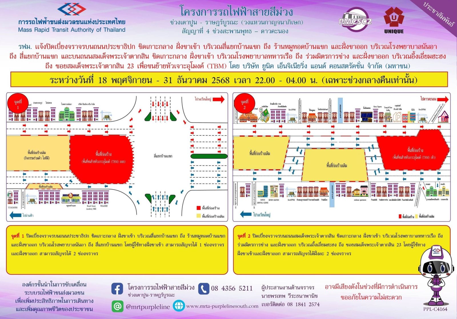 การรถไฟฟ้าขนส่งมวลชนแห่งประเทศไทย (รฟม.) แจ้งว่า บริษัท ยูนิค เอ็นจิเนียริ่ง แอนด์ คอนสตรัคชั่น จำกัด (มหาชน) ผู้รับจ้างงานออกแบบและก่อสร้างอุโมงค์ทางวิ่งและสถานีใต้ดิน โครงการรถไฟฟ้าสายสีม่วง ช่วงเตาปูน - ราษฎร์บูรณะ (วงแหวนกาญจนาภิเษก) สัญญาที่ 4 ช่วงสะพานพุทธ - ดาวคะนอง มีความจำเป็นต้องปิดเบี่ยงจราจรบนถนนประชาธิปก ชิดเกาะกลาง ฝั่งขาเข้า บริเวณสี่แยกบ้านแขก ถึง ร้านหมูทอดบ้านแขก และฝั่งขาออก บริเวณโรงพยาบาลนันอา ถึง สี่แยกบ้านแขก และบนถนนสมเด็จพระเจ้าตากสิน ชิดเกาะกลาง ฝั่งขาเข้า บริเวณโรงพยาบาลทหารเรือ ถึง ร่วมมิตรการช่าง และฝั่งขาออก บริเวณอึ้งเอี่ยมฮะฮง ถึง ซอยสมเด็จพระเจ้าตากสิน 23 เพื่อขนย้ายหัวเจาะอุโมงค์ (TBM) ระหว่างวันที่ 18 พฤศจิกายน - 31 ธันวาคม 2568 เวลา 22.00 - 04.00 น. (เฉพาะช่วงกลางคืนเท่านั้น) โดยมีการจัดการจราจร 2 จุด ดังนี้
