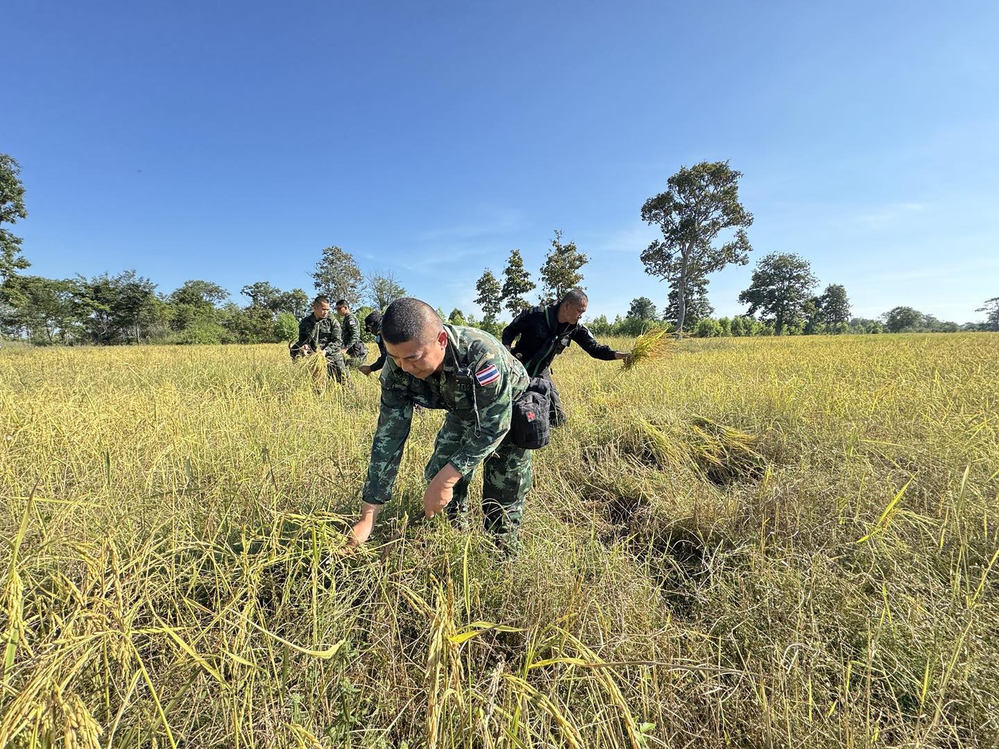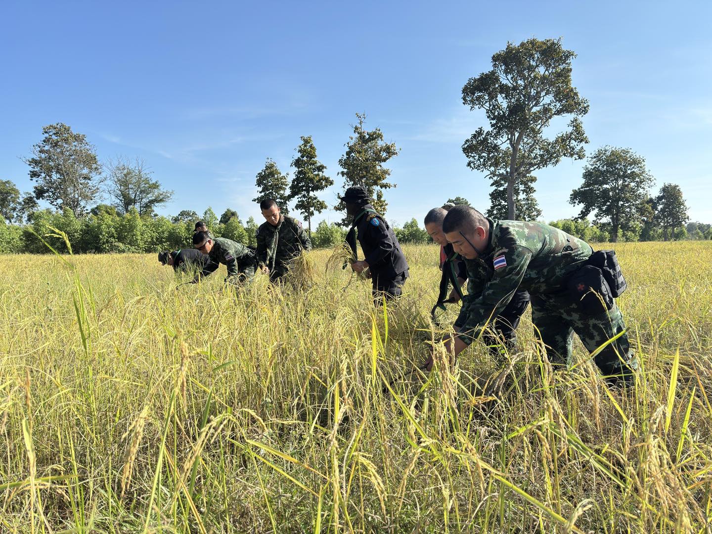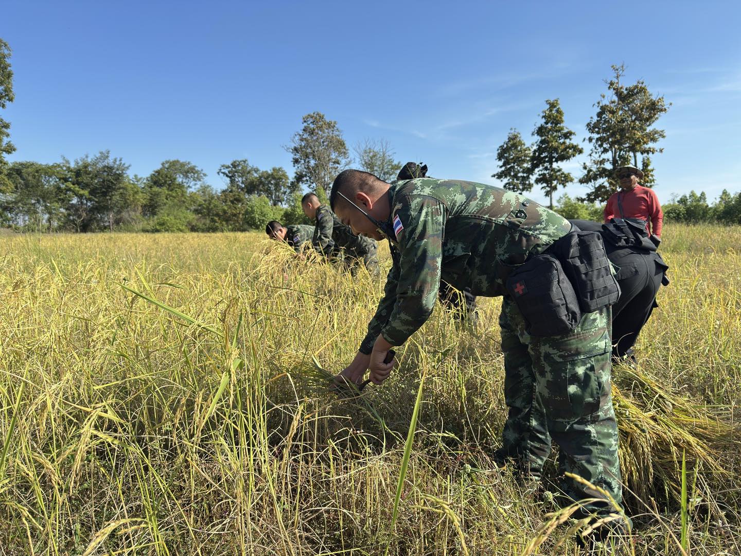ร.ท.อาทิตย์ ทิยาโน ทหาร ฉก.12 กล่าวว่า ผบ.หน่วยเฉพาะกิจที่ 12 มีความห่วงใยประชาชน จึงจัดเจ้าหน้าที่เข้ามาดูแลความปลอดภัยในช่วงการเก็บเกี่ยวผลผลิตทางการเกษตร และจัดกำลังพลทหารมาช่วยเก็บเกี่ยวในจุดที่รถเกี่ยวเข้าไม่ถึง โดยขณะนี้มีชาวบ้านร้องขอความช่วยเหลือเข้ามาเพิ่มขึ้นทุกวัน จึงต้องมีการจัดคิวดูแล ทั้งวันนี้ พรุ่งนี้ และวันอังคาร รวมถึงเกือบทุกวันจนกว่าจะหมดฤดูเก็บเกี่ยว ในช่วงฤดูทำนาและใส่ปุ๋ย ก็อนุญาตให้ชาวบ้านเข้ามาดำเนินการได้เช่นกัน โดยบางช่วงที่มีเหตุการณ์ตึงเครียด ชาวบ้านไม่กล้าเข้าพื้นที่ เนื่องจากเป็นแนวพื้นที่ติดชายแดนดินต่อดิน ทางทหารจึงขอให้ชาวบ้านแจ้งหน่วยทหารก่อนทุกครั้ง เพื่อจัดกำลังเข้ารักษาความปลอดภัยให้ หรือหากได้คิวเกี่ยวข้าวช่วงเวลาใด ก็ขอให้แจ้งทหารตามจุดตรวจ เพื่อจะได้เข้ามาดูแลอย่างใกล้ชิด