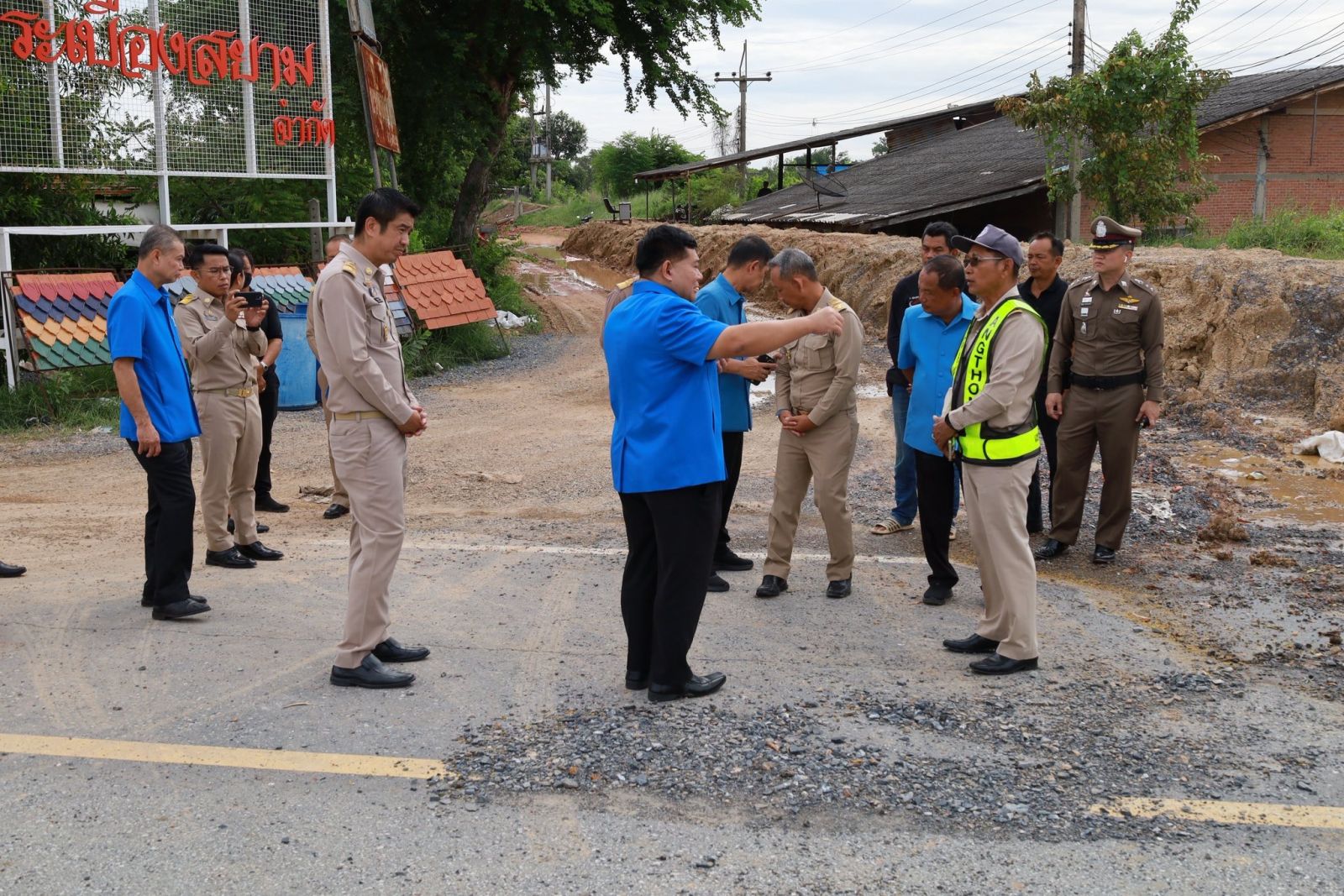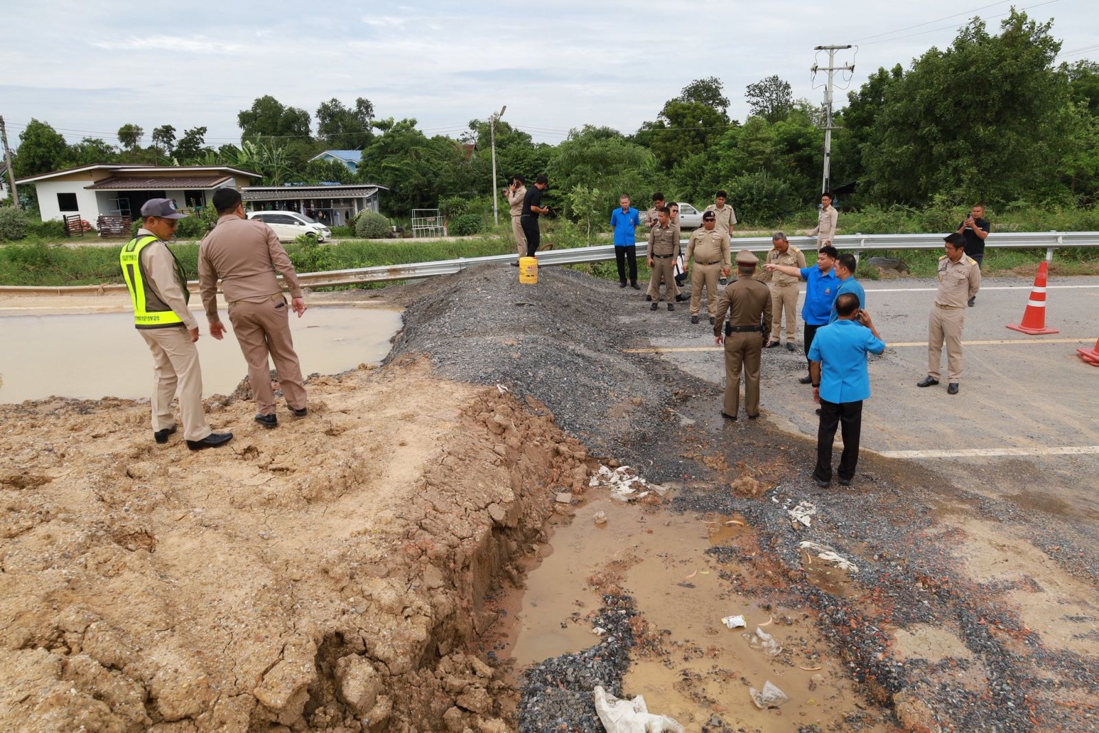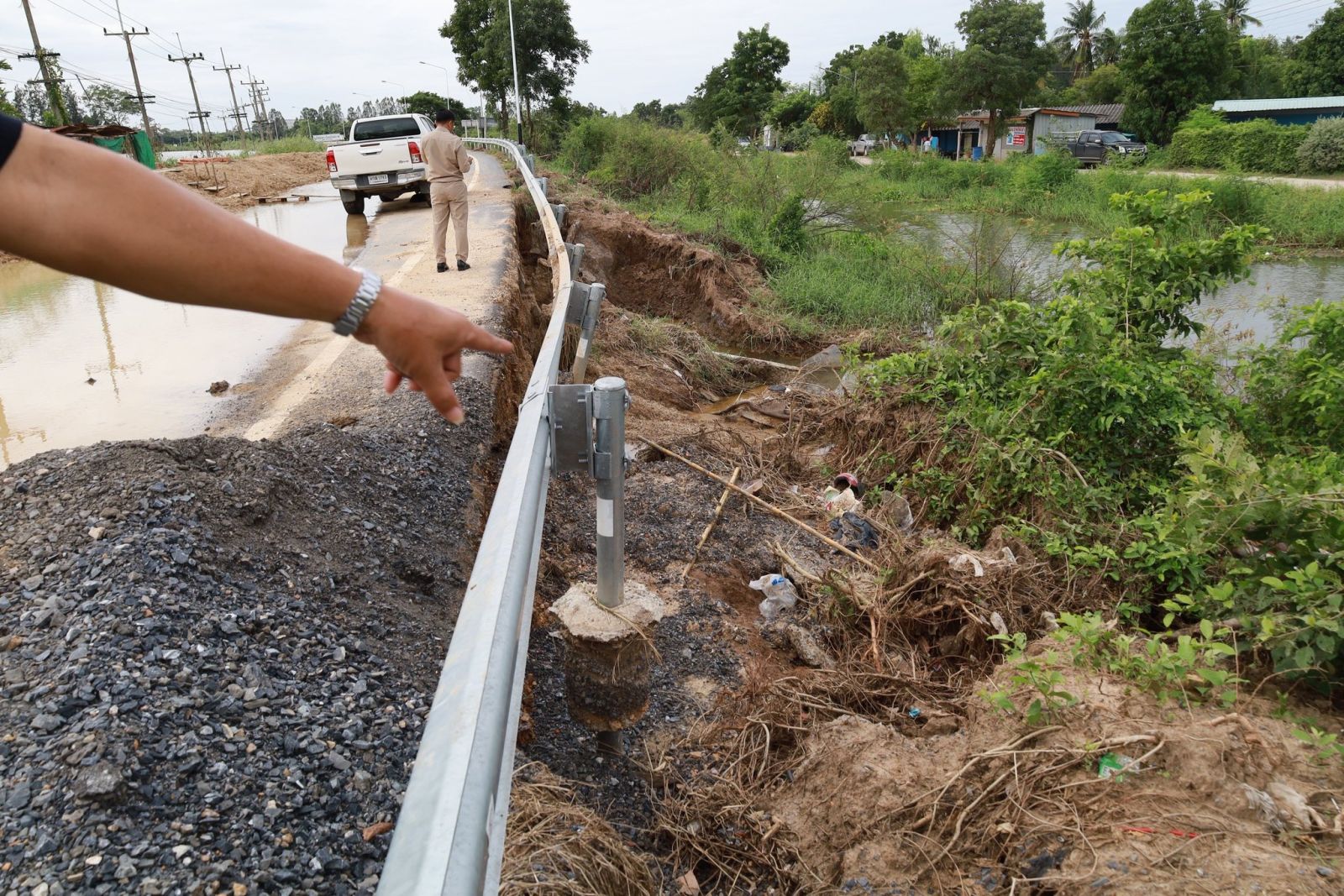 จากนั้น ยังได้ตรวจสอบบริเวณถนนอ่างทอง-ป่าโมก สายใน เพื่อติดตามการซ่อมแซมถนนที่ถูกน้ำท่วมผิวการจราจรและเซาะข้างทาง ได้รับความเสียหาย เบื้องต้น ได้ให้แขวงทางหลวงอ่างทองตรวจสอบตลอดแนวถนนว่ามีโพรงหรือไม่ โดยเฉพาะในจุดเสี่ยงต่าง ๆ ก่อนเริ่มดำเนินการซ่อมแซม เพื่อให้สามารถเปิดถนนใช้ในการสัญจรได้โดยเร็ว ลดผลกระทบต่อประชาชน