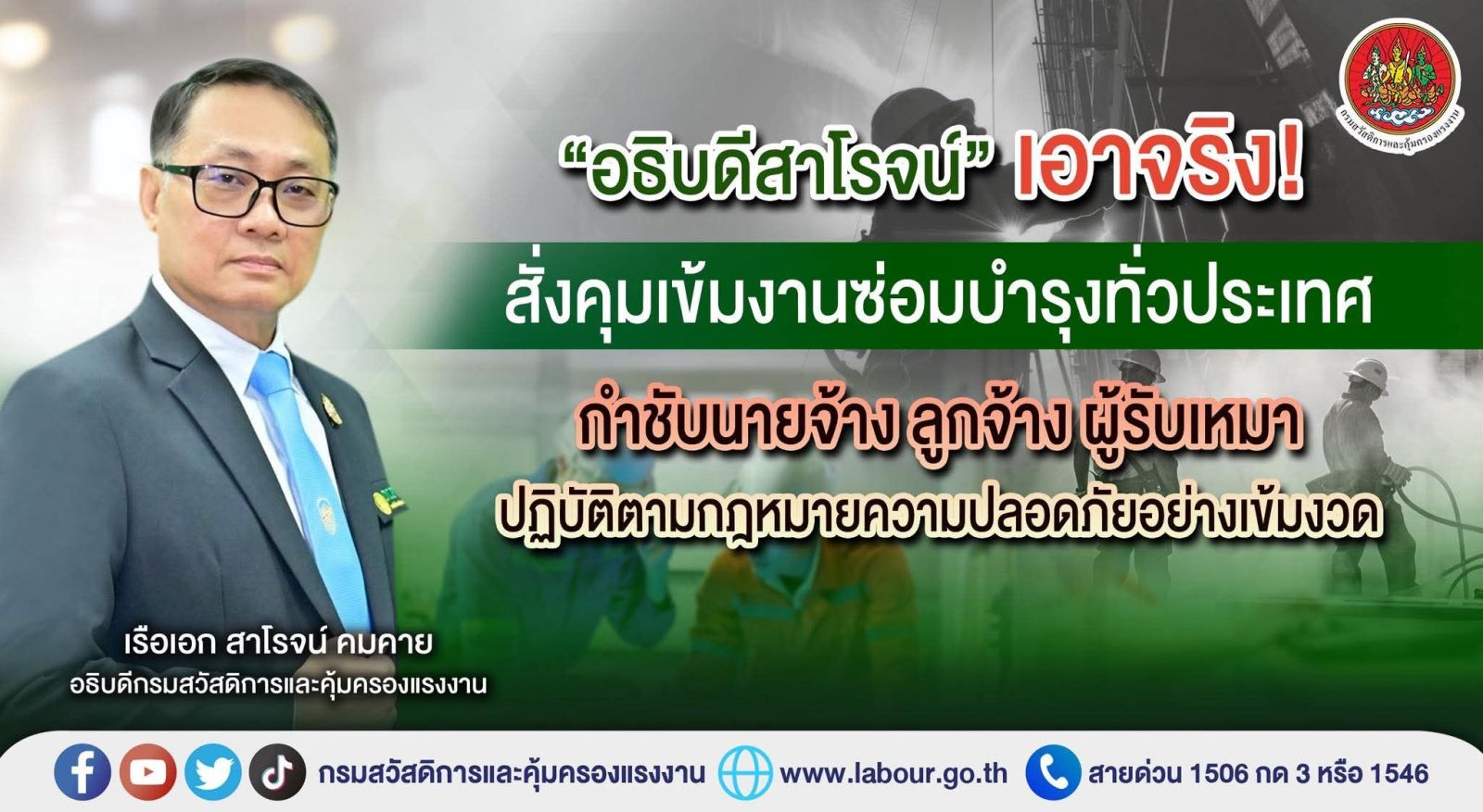 เรือเอก สาโรจน์ คมคาย อธิบดีกรมสวัสดิการและคุ้มครองแรงงาน (กสร.) เปิดเผยว่า จากสถานการณ์ที่มีข่าวเกิดอุบัติเหตุร้ายแรงจากการทำงานในสถานประกอบกิจการบ่อยครั้ง โดยเฉพาะงานซ่อมบำรุงเครื่องจักร อุปกรณ์ไฟฟ้า งานซ่อมบำรุงในพื้นที่สูงและที่อับอากาศ รวมถึงการทำความสะอาดในพื้นที่อันตราย เช่น บ่อบำบัดน้ำเสีย ถังและระบบท่อบรรจุสารเคมี ซึ่งเป็นเหตุให้เกิดความสูญเสียต่อทั้งชีวิตและทรัพย์สินของนายจ้าง ลูกจ้าง และระบบเศรษฐกิจโดยรวมนั้น นางสาวตรีนุช เทียนทอง รัฐมนตรีว่าการกระทรวงแรงงาน ได้แสดงความห่วงใยต่อความปลอดภัยในการทำงานที่เกิดขึ้น และมีข้อสั่งการให้กรมสวัสดิการและคุ้มครองแรงงานเร่งยกระดับมาตรการเชิงรุกในการป้องกันอุบัติเหตุดังกล่าว กรมฯ ได้ดำเนินการตามข้อสั่งการโดยกำชับให้สำนักงานสวัสดิการและคุ้มครองแรงงานจังหวัดทั่วประเทศ เร่งตรวจกำกับสถานประกอบกิจการกลุ่มเสี่ยงให้ปฏิบัติตามพระราชบัญญัติความปลอดภัย อาชีวอนามัย และสภาพแวดล้อมในการทำงาน พ.ศ. 2554 และกฎกระทรวงที่เกี่ยวข้องอย่างเคร่งครัด โดยเฉพาะสถานประกอบกิจการที่มีแผนซ่อมบำรุงหรือทำความสะอาดเครื่องจักรและอุปกรณ์ในช่วงปลายปี รวมถึงตลอดช่วงเวลาของปีถัดไป ที่มีโอกาสเกิดอุบัติเหตุร้ายแรงสูง