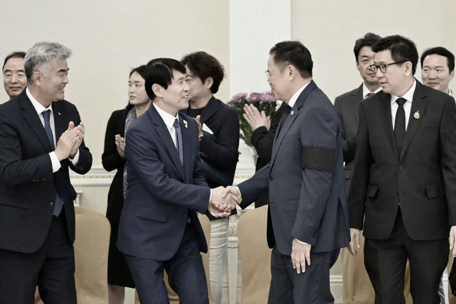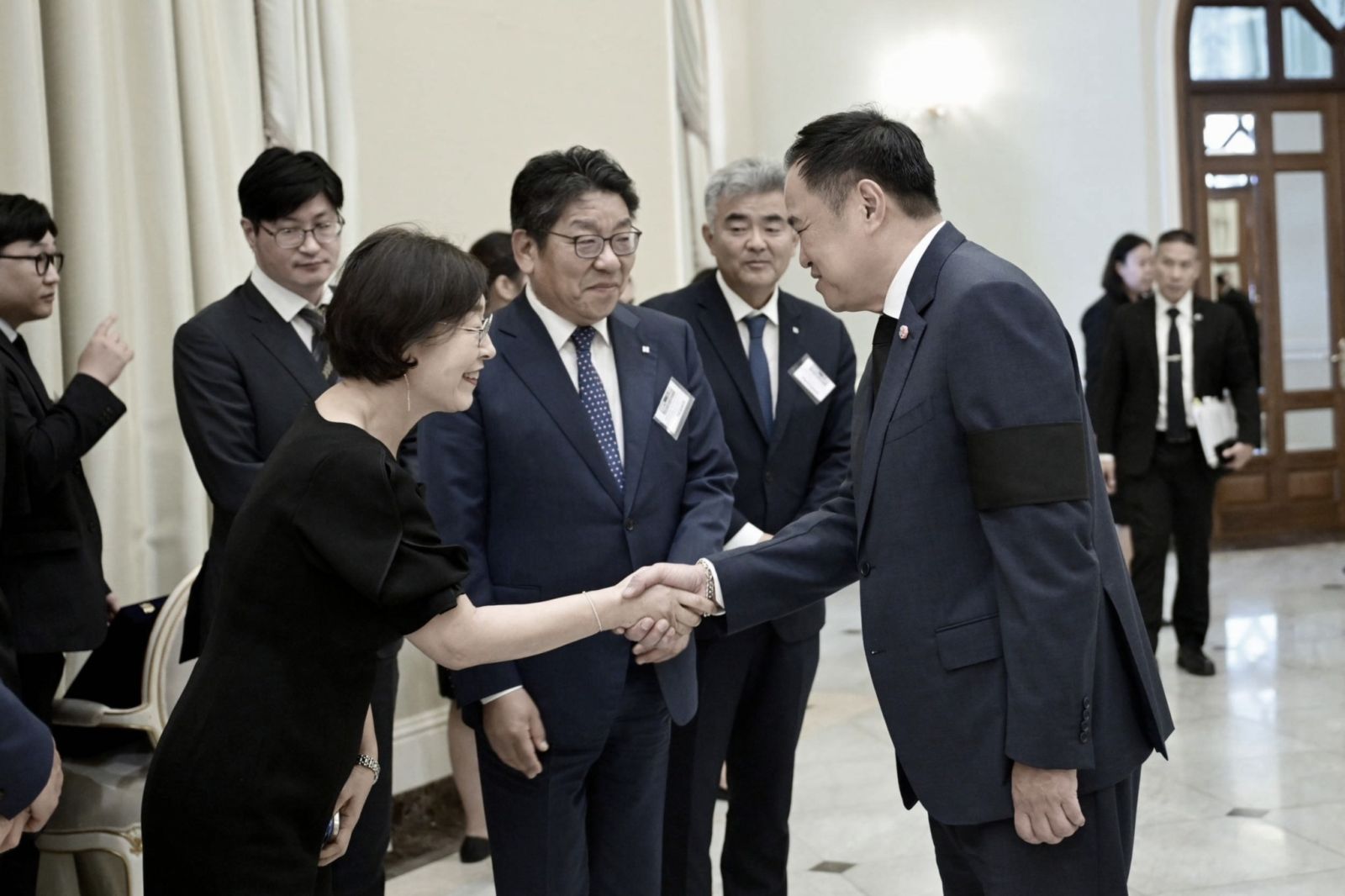 ด้านรองประธานรัฐสภาเกาหลีใต้ กล่าวขอบคุณนายกรัฐมนตรีที่สละเวลาให้คณะนักธุรกิจและนักลงทุนเกาหลีใต้เข้าเยี่ยมคารวะ พร้อมแสดงความอาลัยต่อการเสด็จสวรรคตของสมเด็จพระนางเจ้าสิริกิติ์ พระบรมราชินีนาถ พระบรมราชชนนีพันปีหลวง และขอบคุณไทยที่เคยส่งทหารเข้าร่วมรบในสงครามเกาหลี โดยย้ำว่าไทยเป็นมิตรประเทศที่สำคัญของเกาหลีใต้ ทั้งสองประเทศมีความสัมพันธ์ใกล้ชิดมายาวนานและมีความร่วมมือเพิ่มขึ้นในหลายสาขา โดยเฉพาะด้านการค้าและการลงทุนในอุตสาหกรรมใหม่ ๆ ทั้งนี้ ขอให้รัฐบาลไทยช่วยดูแลนักธุรกิจ–นักลงทุนและนักท่องเที่ยวชาวเกาหลีใต้ในไทย ส่วนรัฐบาลเกาหลีใต้พร้อมดูแลแรงงานไทยในเกาหลีใต้ รวมถึงการผ่อนปรนหลักเกณฑ์การขอวีซ่าทำงานและการขยายกฎเกณฑ์การทำงานในเกาหลีใต้
