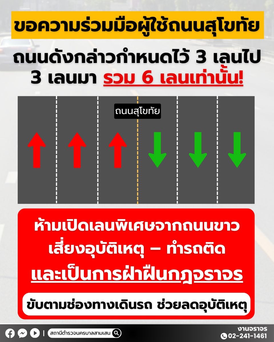 สน.สามเสน ขอความร่วมมือผู้ใช้เส้นทางถนนสุโขทัย" ถนนสุโขทัยกำหนดไว้ 3 เลนไป – 3 เลนมา รวม 6 เลนเท่านั้น ไม่อนุญาตให้เปิดเลนพิเศษจากถนนขาวลงมาเพิ่มเติมการฝ่าฝืนทำให้เกิดคอขวดและเพิ่มความเสี่ยงอุบัติเหตุ ช่วยกันรักษาระเบียบจราจร เพื่อให้การเดินทางปลอดภัยและลื่นไหลครับ #รายงานจราจร #ขอความร่วมมือ #ผู้ใช้รถ #FM91