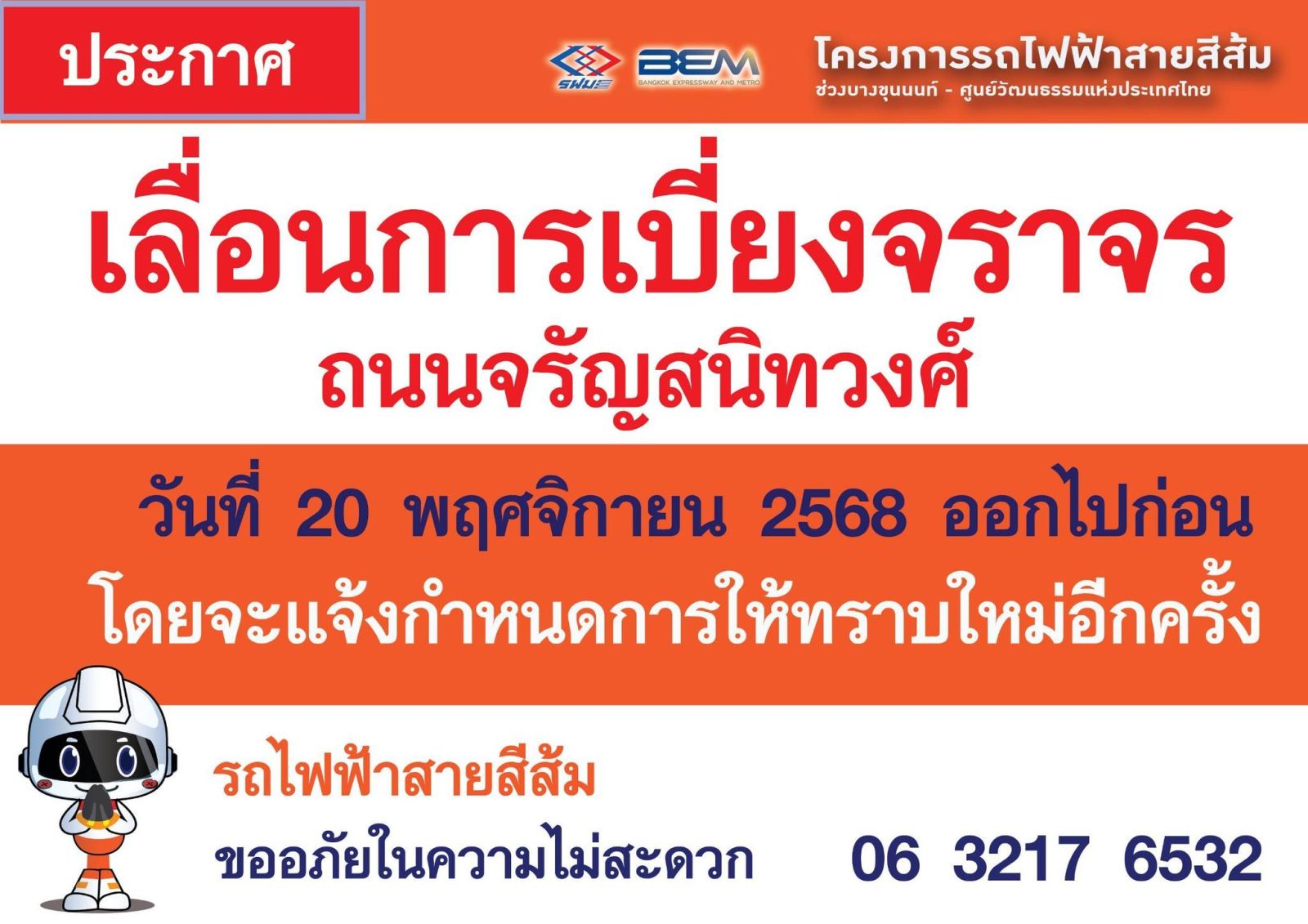 การรถไฟฟ้าขนส่งมวลชนแห่งประเทศไทย (รฟม.) แจ้งขอเลื่อนกำหนดการปิดเบี่ยงจราจรเพิ่มเติม 2 ช่องจราจร บนถนนจรัญสนิทวงศ์ เพื่อดำเนินงานก่อสร้างโครงการรถไฟฟ้าสายสีส้ม ช่วงบางขุนนนท์ - ศูนย์วัฒนธรรมแห่งประเทศไทย ในวันที่ 20 พฤศจิกายน 2568 ออกไปก่อน