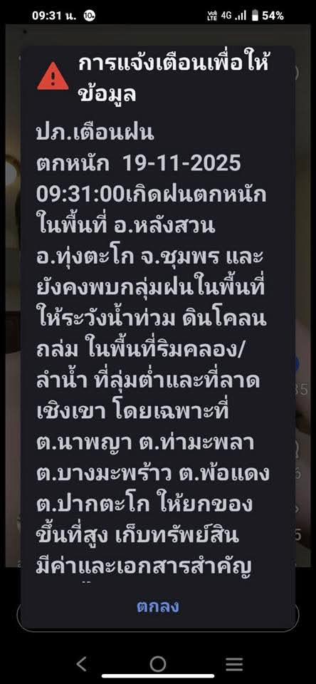 ปภ. จึงได้ร่วมกับผู้ให้บริการเครือข่ายโทรศัพท์เคลื่อนที่ AIS True และ NT ส่งข้อความแจ้งเตือนผ่าน Cell Broadcast แจ้งเตือนฝนตกหนัก อ.หลังสวน อ.ทุ่งตะโก จ.ชุมพร