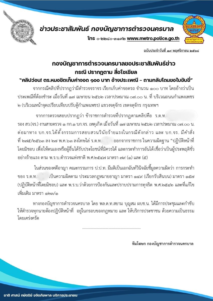 (19 พ.ย.2568) จากกรณีคลิปที่ปรากฏว่ามีตํารวจจราจร เรียกเก็บค่าจอดรถ จํานวน 100 บาท โดยอ้างว่าเป็น ประเพณีที่ต้องชําระ เมื่อวันที่ 17 เมษายน 2562 เวลาประมาณ 07.00 น. ที่ บริเวณถนนกําแพงเพชร 2 (บริเวณหน้าจดเปรียบเทียบปรับตู้กําแพงเพชร) แขวงจตุจักร เขตจตุจักร กรุงเทพฯ