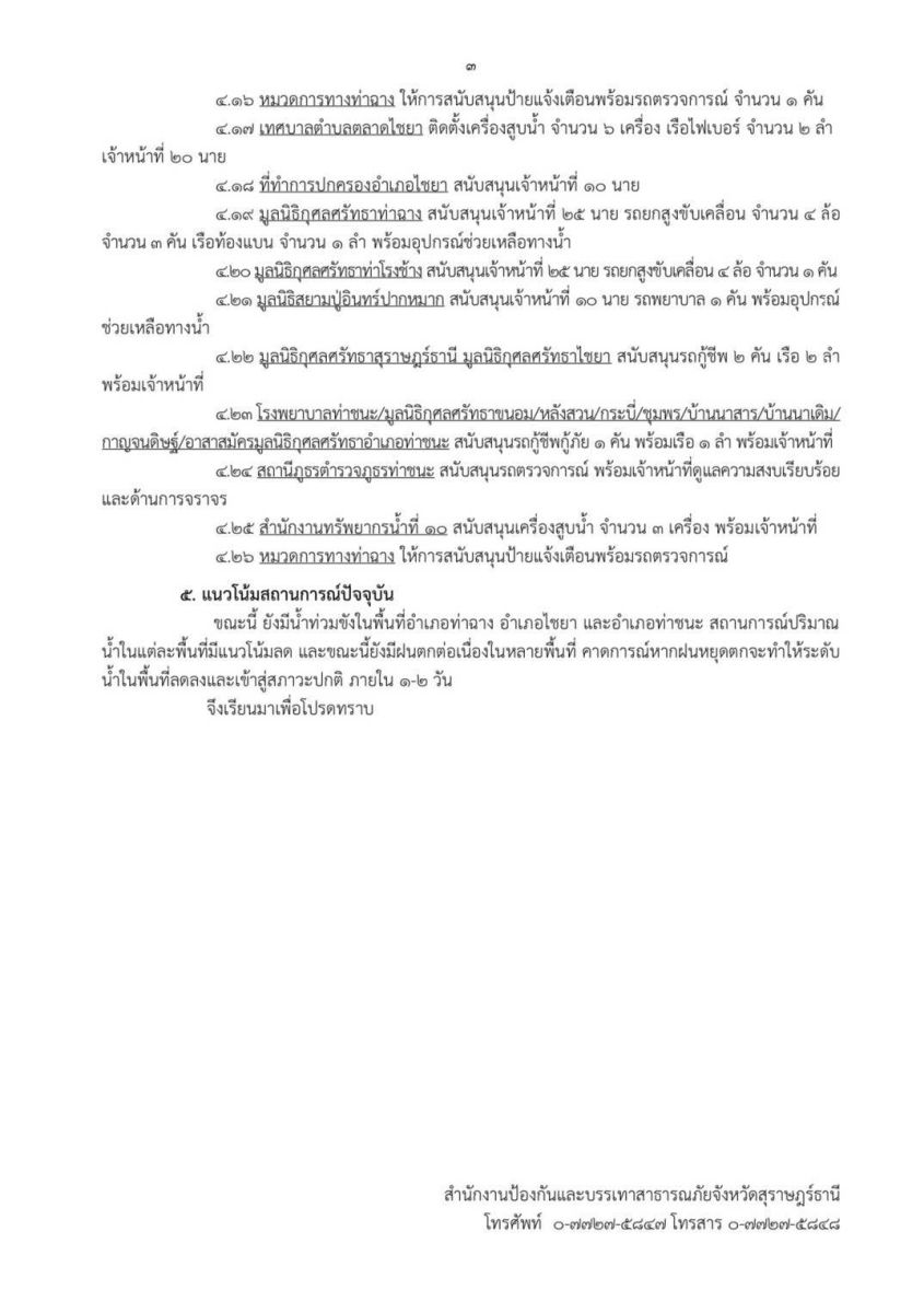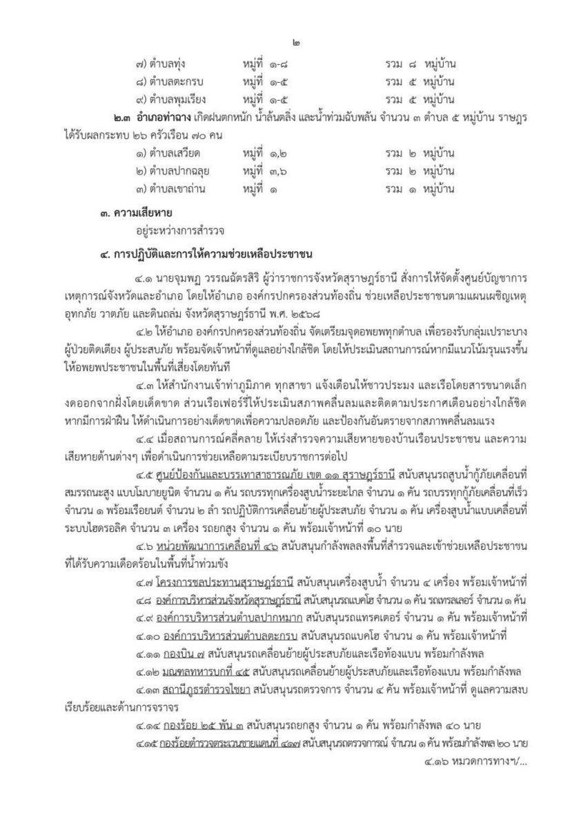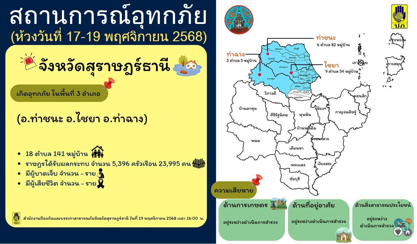 เพจสำนักงานประชาสัมพันธ์จังหวัดสุราษฯ โพสต์รายงาน จากเหตุการณ์เกิดฝนตกต่อเนื่องในวันที่ 17–19 พฤศจิกายน 2568 ส่งผลให้หลายพื้นที่ของจังหวัดสุราษฎร์ธานีประสบปัญหาน้ำล้นตลิ่งและน้ำท่วมฉับพลัน ครอบคลุม 3 อำเภอ ได้แก่ อำเภอท่าชนะ อำเภอไชยา และอำเภอท่าฉาง รวม 18 ตำบล 141 หมู่บ้าน มีประชาชนได้รับผลกระทบ 23,995 คน แม้ยังไม่มีผู้บาดเจ็บหรือเสียชีวิต แต่หลายจุดยังคงมีน้ำท่วมขัง โดยเฉพาะอำเภอไชยาที่ได้รับผลกระทบมากที่สุด