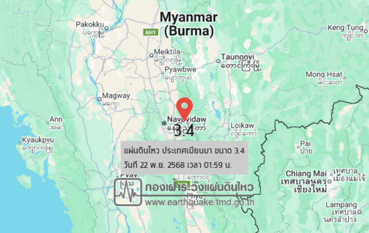 วันที่ 22 พ.ย. 2568 เวลา 01.59 น. กองเฝ้าระวังแผ่นดินไหว กรมอุตุนิยมวิทยา แจ้งเหตุแผ่นดินไหว ขนาด 3.4 ลึก 10 กม. ภายในพื้นที่ของประเทศเมียนมา (19.77°N,96.44°E) ศูนย์กลางห่างออกไปทางทิศตะวันตกเฉียงเหนือของ อ.เมือง จ.แม่ฮ่องสอน ประมาณ 169 กม. ยังไม่มีรายงานผลกระทบต่อประเทศไทย