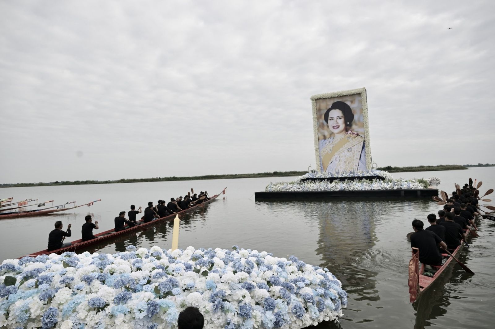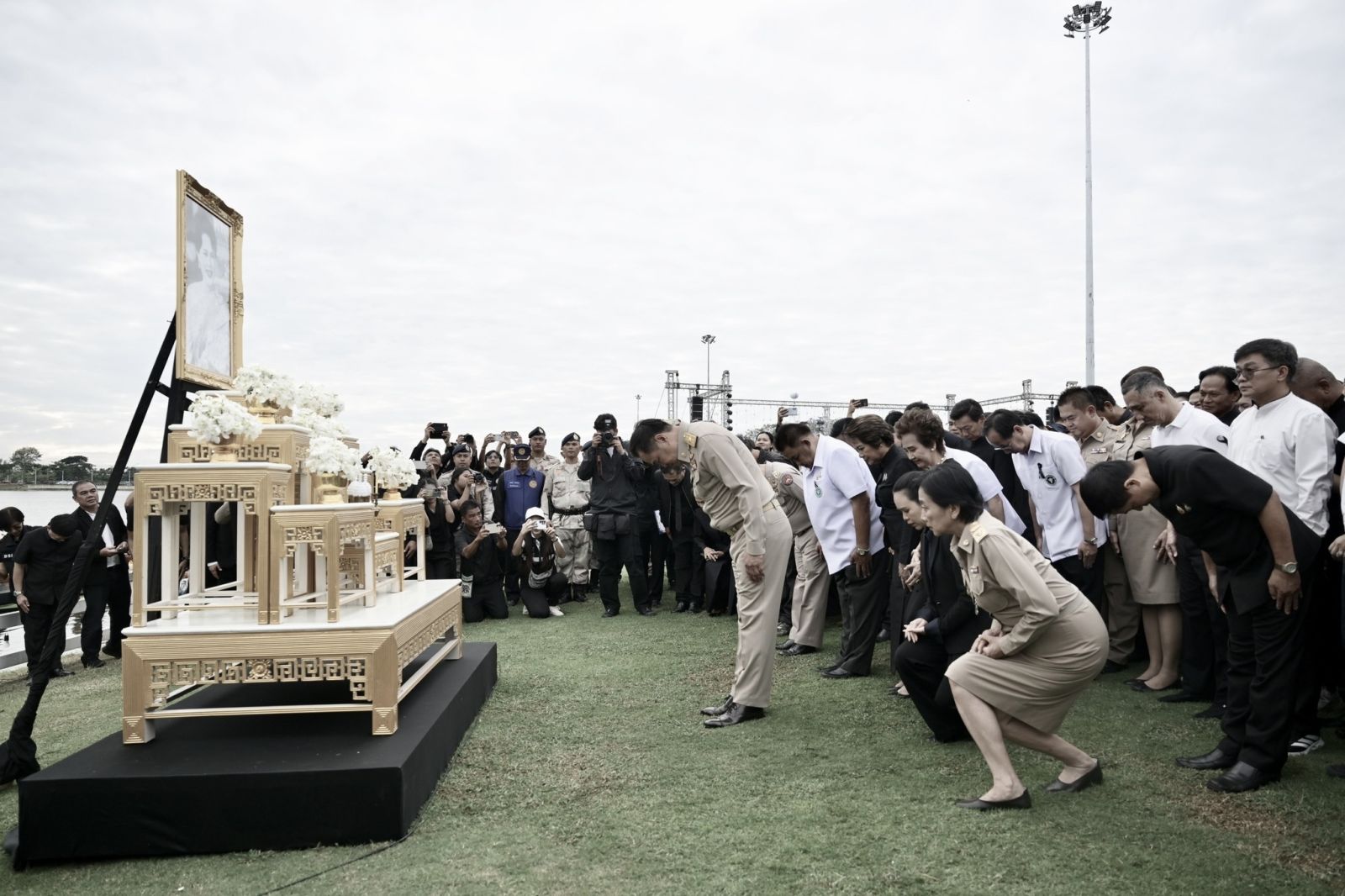 เมื่อถึงบริเวณเปิดงาน นายกรัฐมนตรี ได้ถวายความเคารพเบื้องหน้าพระบรมฉายาลักษณ์สมเด็จพระนางเจ้าสิริกิติ์ พระบรมราชินีนาถ พระบรมราชชนนีพันปีหลวง พร้อมนำพสกนิกรทุกหมู่เหล่า ยืนตรงสงบนิ่งถวายความอาลัยเป็นเวลา 1 นาที จากนั้น นายกรัฐมนตรีลอยกระทงดอกไม้ถวายความอาลัย