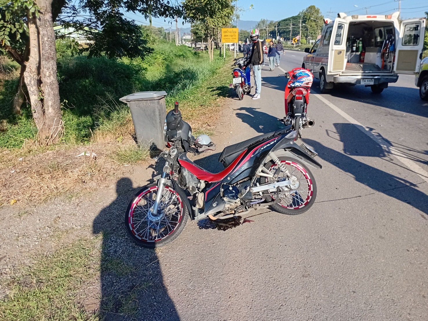 แรงชนทำให้ผู้ขับขี่รถจักรยานยนต์ได้รับบาดเจ็บ 1 ราย ถือเป็นผู้บาดเจ็บรายแรกของทริปฯ เจ้าหน้าที่กู้ภัยเข้าปฐมพยาบาลก่อนนำส่งโรงพยาบาล โดยไม่มีรายงานผู้เสียชีวิต