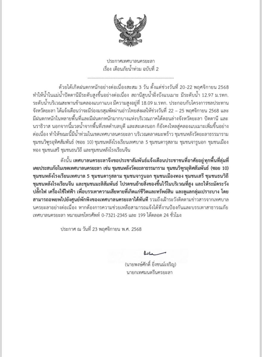 ‼โปรดขนย้ายสิ่งของขึ้นไว้ในบริเวณที่สูง และให้ระมัดระวังปลั๊กไฟ เครื่องใช้ไฟฟ้า เพื่อบรรเทาความเสียหายที่เกิดแก่ชีวิตและทรัพย์สิน และดูแลกลุ่มเปราะบาง โดยสามารถอพยพไปยังศูนย์พักพิงของเทศบาลนครยะลาได้ทันที ‼