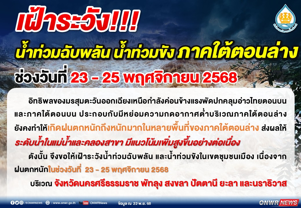 ** พื้นที่ที่ต้องเฝ้าระวังเป็นพิเศษ ได้แก่ นครศรีธรรมราช • พัทลุง • สงขลา • ปัตตานี • ยะลา • นราธิวาส ขอให้ประชาชนตรวจสอบเส้นทางสัญจร ติดตามประกาศจากหน่วยงานรัฐอย่างใกล้ชิด และเตรียมความพร้อมรับมือสถานการณ์ฝนตกหนักในช่วงวันที่ 23 – 25 พฤศจิกายนนี้