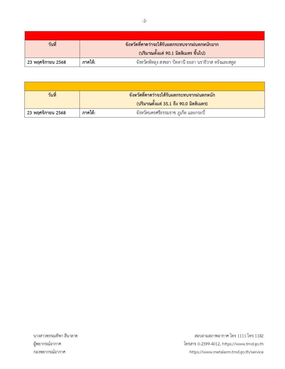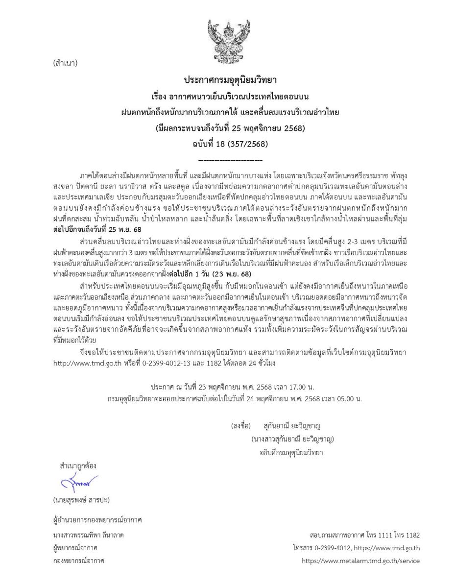 ระบุว่า ภาคใต้ตอนล่างมีฝนตกหนักหลายพื้นที่ และมีฝนตกหนักมากบางแห่ง โดยเฉพาะบริเวณจังหวัดนครศรีธรรมราช พัทลุง สงขลา ปัตตานี ยะลา นราธิวาส ตรัง และสตูล เนื่องจากมีหย่อมความกดอากาศต่ำปกคลุมบริเวณทะเลอันดามันตอนล่าง และประเทศมาเลเซีย ประกอบกับมรสุมตะวันออกเฉียงเหนือที่พัดปกคลุมอ่าวไทยตอนบน ภาคใต้ตอนบน และทะเลอันดามันตอนบนยังคงมีกำลังค่อนข้างแรง ขอให้ประชาชนบริเวณภาคใต้ตอนล่างระวังอันตรายจากฝนตกหนักถึงหนักมาก ฝนที่ตกสะสม น้ำท่วมฉับพลัน น้ำป่าไหลหลาก และน้ำล้นตลิ่ง โดยเฉพาะพื้นที่ลาดเชิงเขาใกล้ทางน้ำไหลผ่านและพื้นที่ลุ่ม ต่อไปอีกจนถึงวันที่ 25 พ.ย. 68 ส่วนคลื่นลมบริเวณอ่าวไทยและห่างฝั่งของทะเลอันดามันมีกำลังค่อนข้างแรง โดยมีคลื่นสูง 2-3 เมตร บริเวณที่มี ฝนฟ้าคะนองคลื่นสูงมากกว่า 3 เมตร ขอให้ประชาชนภาคใต้ฝั่งตะวันออกระวังอันตรายจากคลื่นที่ซัดเข้าหาฝั่ง ชาวเรือบริเวณอ่าวไทยและทะเลอันดามันเดินเรือด้วยความระมัดระวังและหลีกเลี่ยงการเดินเรือในบริเวณที่มีฝนฟ้าคะนอง สำหรับเรือเล็กบริเวณอ่าวไทยและห่างฝั่งของทะเลอันดามันควรงดออกจากฝั่งต่อไปอีก 1 วัน (23 พ.ย. 68)