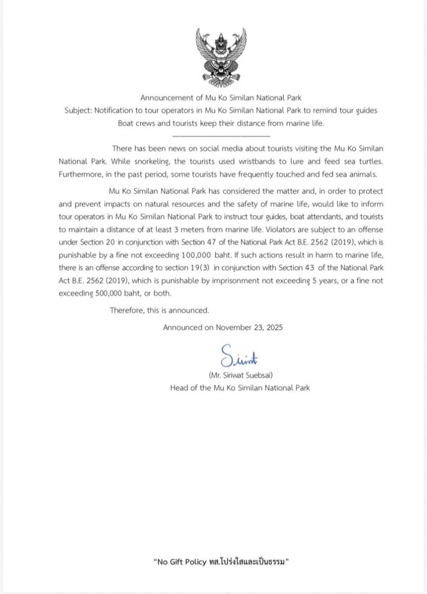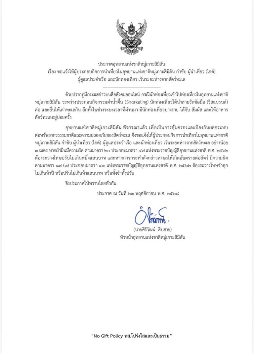 ทั้งนี้ เพื่อเป็นการคุ้มครองและป้องกันผลกระทบต่อทรัพยากรธรรมชาติและความปลอดภัยของสัตว์ทะเล จึงขอแจ้งให้ผู้ประกอบกิจการนำเที่ยวในอุทยานแห่งชาติหมู่เกาะสิมิลัน กำชับผู้นำเที่ยว(ไกด์) ผู้ดูแลประจำเรือและนักท่องเที่ยว เว้นระยะห่างจากสัตว์ทะเล อย่างน้อย 3 เมตร หากฝ่าฝืนมีความผิด ตามมาตรา 20 ประกอบมาตรา 47 แห่งพระราชบัญญัติอุทยานแห่งชาติ พ.ศ. 2562 ต้องระวางโทษปรับไม่เกินหนึ่งแสนบาท และหากการกระทำดังกล่าวส่งผลให้เกิดอันตรายต่อสัตว์ มีความผิดตามมาตรา 19 (3) ประกอบมาตรา 43 แห่งพระราชบัญญัติอุทยานแห่งชาติ พ.ศ. 2562 ต้องระวางโทษจำคุกไม่เกินห้าปี หรือปรับไม่เกินห้าแสนบาท หรือทั้งจำทั้งปรับ