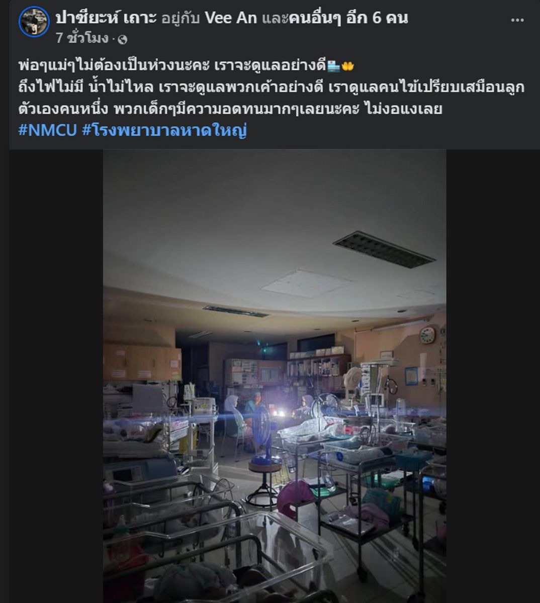 รพ.หาดใหญ่ วิกฤติหนักสุด น้ำใกล้ท่วมเครื่องปั่นไฟ อัพเดทจุดช่วยเหลือสาธารณสุข) ล่าสุด ผู้ใช้เฟซบุ๊ก ปาซียะห์ เถาะ ซึ่งเป็นบุคลากรทางการแพทย์ในโรงพยาบาลหาดใหญ่ ได้โพสต์ภาพพร้อมข้อความระบุว่า "พ่อๆแม่ๆไม่ต้องเป็นห่วงนะคะ เราจะดูแลอย่างดี ถึงไฟไม่มี น้ำไม่ไหล เราจะดูแลพวกเค้าอย่างดี เราดูแลคนไข้เปรียบเสมือนลูกตัวเองคนหนึ่ง พวกเด็กๆมีความอดทนมากๆเลยนะคะ ไม่งอแงเลย NMCU โรงพยาบาลหาดใหญ่"