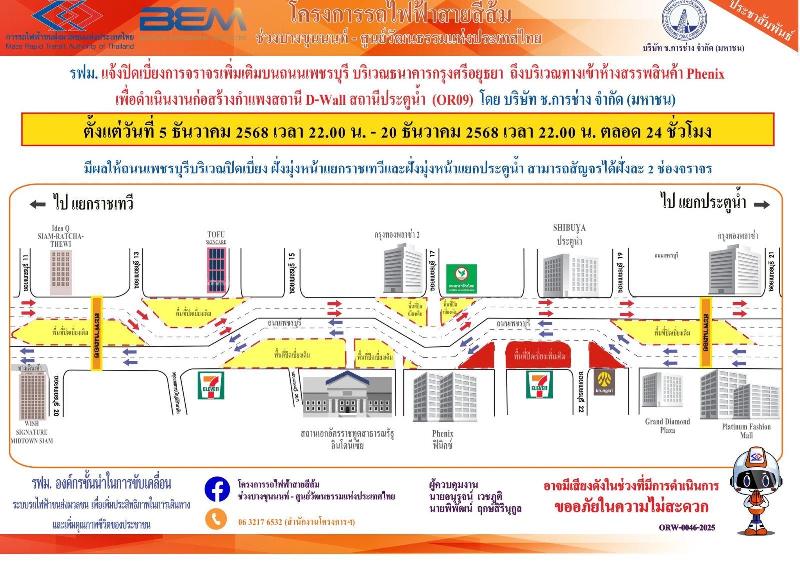 2. วันที่ 20 ธันวาคม 2568 เวลา 22.01 น. – 30 มิถุนายน 2569 เวลา 24.00 น. ตลอด 24 ชั่วโมง ปิดเบี่ยงการจราจรเพิ่มเติม 2 ช่องจราจร บนถนนเพชรบุรี ฝั่งมุ่งหน้าแยกราชเทวี บริเวณหน้าห้างสรรพสินค้า Phenix มีผลให้ถนนเพชรบุรีบริเวณปิดเบี่ยง ฝั่งมุ่งหน้าแยกราชเทวีและฝั่งมุ่งหน้าแยกประตูน้ำ สามารถสัญจรได้ฝั่งละ 2 ช่องจราจร โดยประชาชนสามารถเข้า – ออกที่พักอาศัยได้ตามปกติ
