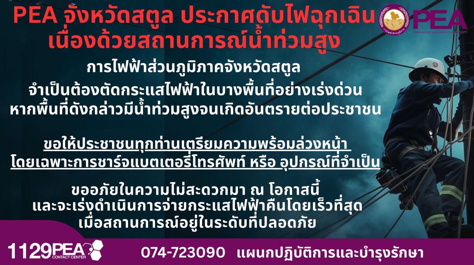 การไฟฟ้าส่วนภูมิภาคจังหวัดสตูลมีความจำเป็นต้องตัดกระแสไฟฟ้าในบางพื้นที่อย่างเร่งด่วน หากพื้นที่ดังกล่าวมีน้ำท่วมสูงเกิดอันตรายต่อประชาชน และเพื่อความปลอดภัยของประชาชนทุกท่าน