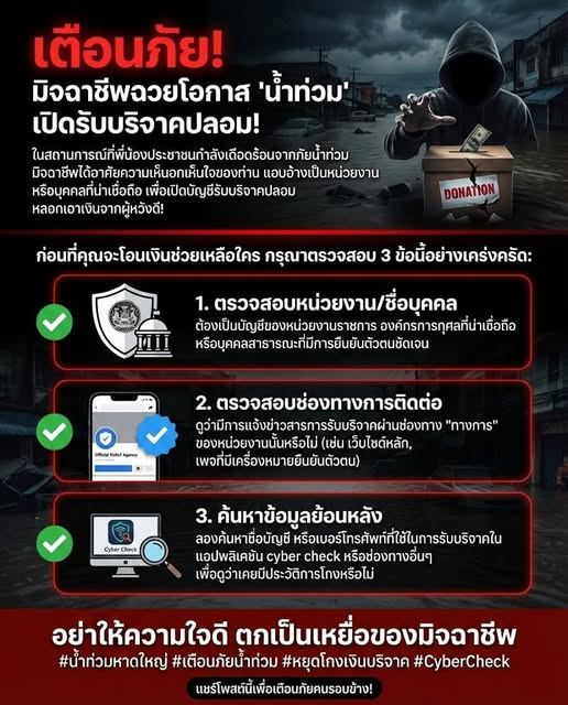 วันที่ 25 พฤศจิกายน 2568 เพจ ตำรวจไซเบอร์ - กองบัญชาการตำรวจสืบสวนสอบสวนอาชญากรรมทางเทคโนโลยี (บช.สอท.) ได้โพสต์ เตือนภัย! มิจฉาชีพฉวยโอกาส 'น้ำท่วม' เปิดรับบริจาคปลอม โดยระบุว่า