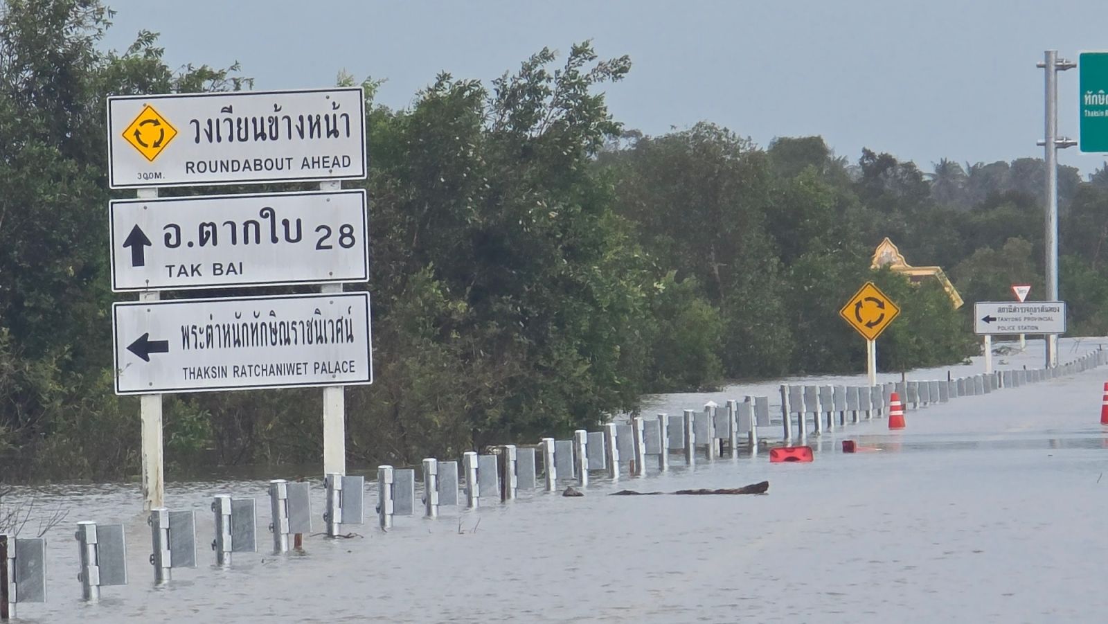 วันที่ 25 พฤศจิกายน 2568 เวลา 10.00 น. นายวีนพัฒน์. บุณฑริก รองผู้ว่าราชการจังหวัด รักษาราชการแทนผู้ว่าราชการจังหวัดนราธิวาส เปิดเผยว่า จากฝนที่ตกหนักต่อเนื่องในพื้นที่ ตั้งแต่วันที่ 20 พ.ย. จนถึงขณะนี้ ปริมาณน้ำฝนสะสมตั้งแต่วันที่ รวม 4 วัน กว่า 1400 มม. ทำให้ในพื้นที่จังหวัดนราธิวาส ได้รับผลกระทบแล้ว 11 อำเภอ จาก 13 อำเภอ ประชาชนได้รับความเดือดร้อน 74,595 ครัวเรือน 255,371 คน และมีผู้เสียชีวิต จำนวน 3 ราย จากการจมน้ำ บ้านเรือนเสียหายบางส่วน 2 หลัง โรงเรียน 12 แห่ง มัสยิด 15 แห่ง วัด 2 แห่ง ถนน 28 สาย สะพาน 1 แห่ง คอสะพานชำรุด 1 แห่ง ดินถล่ม/ดินสไลด์ 3 แห่ง