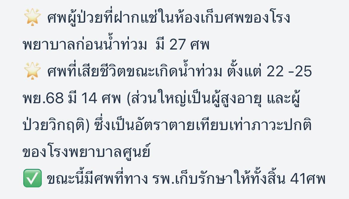 โรงพยาบาลหาดใหญ่ แจงกรณีผู้เสียชีวิตจากเหตตุการณ์น้ำท่วม โดยระบุว่า วันที่ 25 พฤศจิกายน 2568 เวลา 22.50 น. ทางโรงพยาบาลมีศพผู้ป่วยที่ฝากแช่ในห้องเก็บศพของโรงพยาบาลก่อนน้ำท่วม จำนวน 27 ศพ ขณะที่ศพผู้เสียชีวิตขณะเกิดน้ำท่วม ตั้งแต่วันที่ 22 - 25 พย.2568 มี 14 ศพ โดยส่วนใหญ่เป็นผู้สูงอายุ และผู้ป่วยวิกฤต ซึ่งเป็นอัตราตายเทียบเท่าภาวะปกติของโรงพยาบาลศูนย์ขนาดใหญ่
