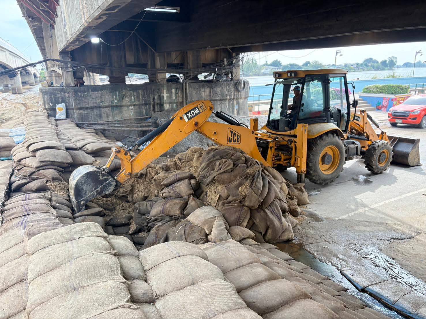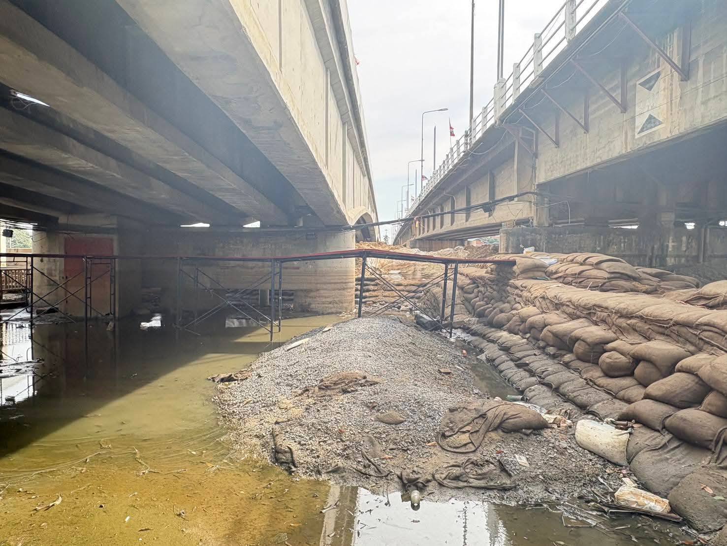 เปิดแนวกระสอบทรายใต้สะพานบางระจัน เพื่อทำการฟื้นฟู ทำความสะอาดให้รถสามารถสัญจรได้