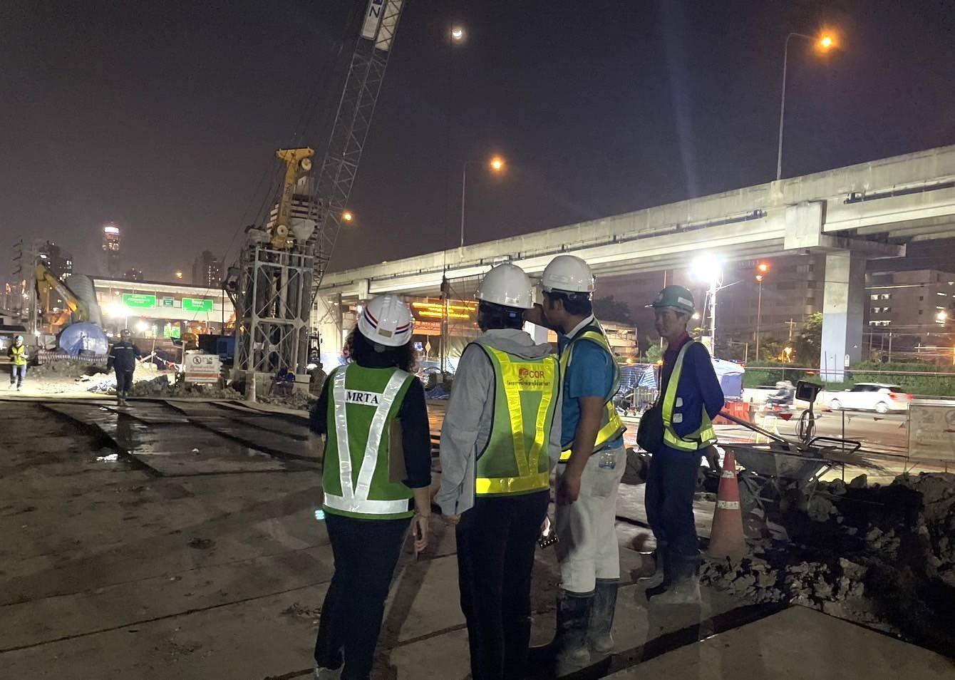 โดยในการลงพื้นที่ครั้งนี้ รฟม. ได้ตรวจสอบการปฏิบัติตามมาตรการป้องกันและแก้ไขผลกระทบสิ่งแวดล้อมในช่วงเวลากลางคืน ตามที่กำหนดไว้ในรายงานการประเมินผลกระทบสิ่งแวดล้อม (EIA) เช่น การปิดคลุมกองดิน กองทราย และเศษวัสดุก่อสร้าง ที่ก่อให้เกิดฝุ่นละอองในระหว่างรอการใช้งานหรือรอการขนย้าย การจัดเก็บขยะ การทำความสะอาดล้อรถก่อนนำรถออกจากพื้นที่ก่อสร้าง รวมถึงทำความสะอาดพื้นที่ก่อสร้างและถนนสาธารณะ การปิดคลุมรถที่ใช้ขนส่งวัสดุก่อสร้างด้วยผ้าใบ เพื่อกันวัสดุตกหล่นและป้องกันการฟุ้งกระจายของฝุ่นละออง การติดตั้งรั้วทึบสูง 2 เมตร และการติดตั้งไฟส่องสว่าง สัญญาณไฟบนรั้วตามแนวพื้นที่ก่อสร้าง การป้องกันน้ำมันรั่วไหลจากเครื่องจักร การฉีดพรมน้ำเพื่อลดการฟุ้งกระจายของฝุ่นละออง การจัดทำทางเดินเท้าชั่วคราวทดแทนทางเดินเท้าเดิมให้มีความปลอดภัย พร้อมป้ายแจ้งบอกแนวเส้นทางเดินเท้า และจัดให้มีเจ้าหน้าที่โครงการฯ คอยอำนวยความสะดวกให้กับประชาชนผู้ใช้เส้นทางในระหว่างที่มีการก่อสร้าง พร้อมกำชับเรื่องการสวมใส่อุปกรณ์คุ้มครองความปลอดภัยส่วนบุคคลตลอดระยะเวลาที่ปฏิบัติงาน และเน้นย้ำให้เจ้าหน้าที่ทุกคนปฏิบัติตามมาตรการป้องกันและแก้ไขผลกระทบสิ่งแวดล้อมอย่างเคร่งครัดต่อไป