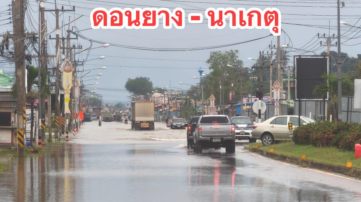 รายงานสถานการณ์น้ำ บริเวณระหว่างแยกดอนยางถึงตลาดบ่อทอง ยังคงมีระดับน้ำท่วมสูง รถเล็กยังไม่สามารถสัญจรได้ ฝั่งขาเข้าเมืองปัตตานี รถทุกชนิดสามารถสัญจรผ่านได้โดยใช้ความระมัดระวัง