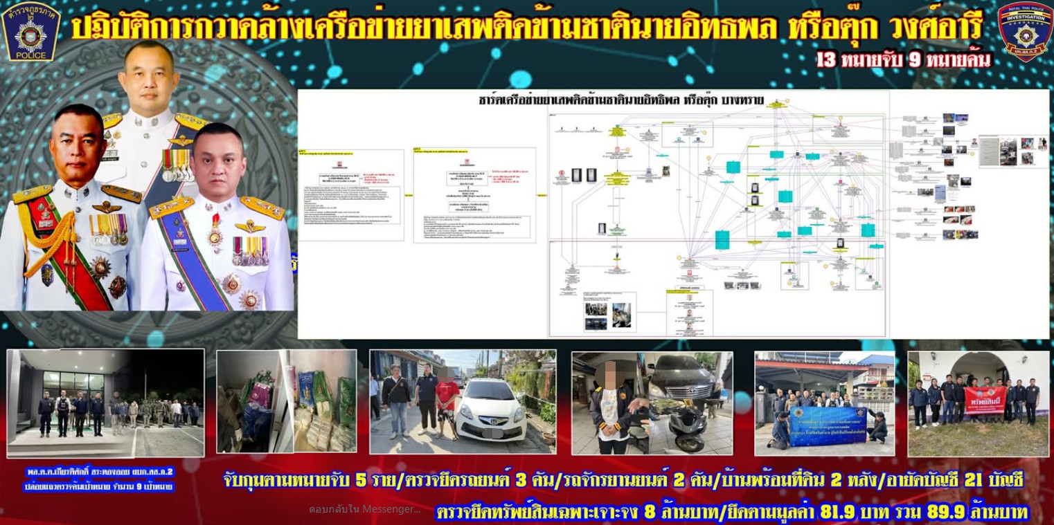 ต่อมาชุดสืบสวนได้เข้าตรวจค้นแหล่งซุกซ่อนยาเสพติดในจังหวัดชลบุรี จำนวน 4 จุด ตรวจยึดไอซ์และเคตามีนผสมรวมกว่า 115 กิโลกรัม จนนำไปสู่การออกหมายจับเครือข่ายรวมทั้งสิ้น 13 ราย และเปิดปฏิบัติการกวาดล้างในวันนี้