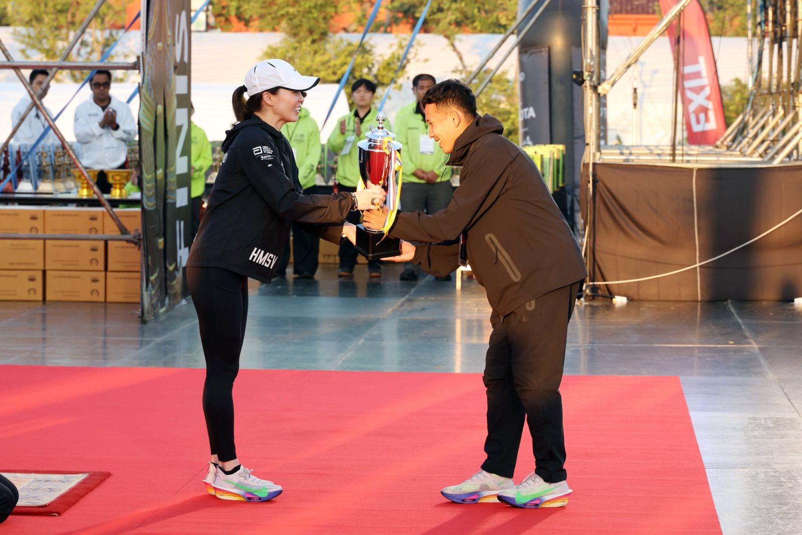 จากนั้นทรงพระดำเนินไปยัง พลับพลาพิธี ท้องสนามหลวง เพื่อพระราชทานถ้วยรางวัล แก่ผู้ชนะเลิศการแข่งขัน ระยะฮาล์ฟมาราธอน ๒๑.๑ กิโลเมตร จำนวน ๔ ราย ประกอบด้วยประเภทมืออาชีพ (อีลิทชาย) ๑ รางวัล ประเภทมืออาชีพ (อีลิทหญิง) ๑ รางวัล ประเภทบุคคลทั่วไป (ชายไทย) ๑ รางวัล ประเภทบุคคลทั่วไป (หญิงไทย) ๑ รางวัล และทรงฉายพระฉายาลักษณ์ร่วมกับนักวิ่งที่ชนะเลิศ คณะกรรมการจัดการแข่งขันฯ และผู้ให้การสนับสนุน ฯ ตามลำดับ