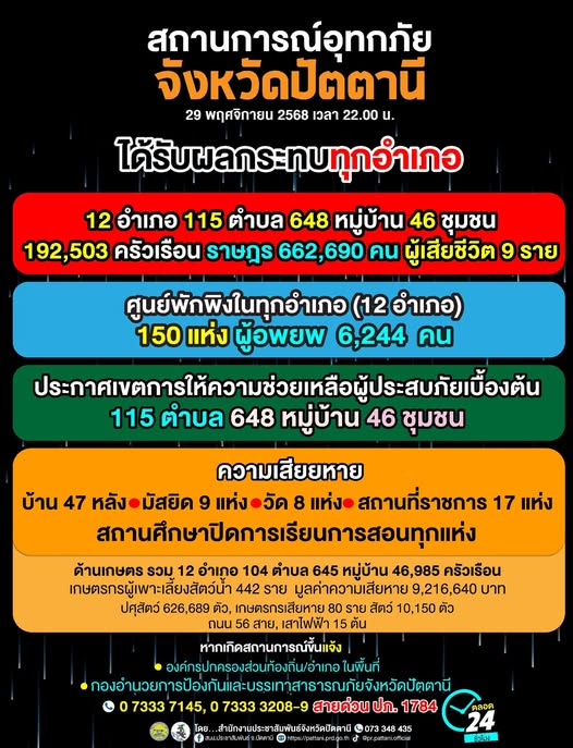 จังหวัดปัตตานีได้รับผลกระทบจากสถานการณ์อุทกภัย โดยข้อมูล วันที่ 29 พ.ย.68 ได้รับผลกระทบหนัก 12 อำเภอ 115 ตำบล 648 หมู่บ้าน 46 ชุมชน 192,503 ครัวเรือน ราษฎร 662,690 คน และ มีผู้เสียชีวิต 7 ราย และผู้ได้รับบาดเจ็บ 1 ราย สถานศึกษา ปิดการเรียนการสอนทุกแห่ง