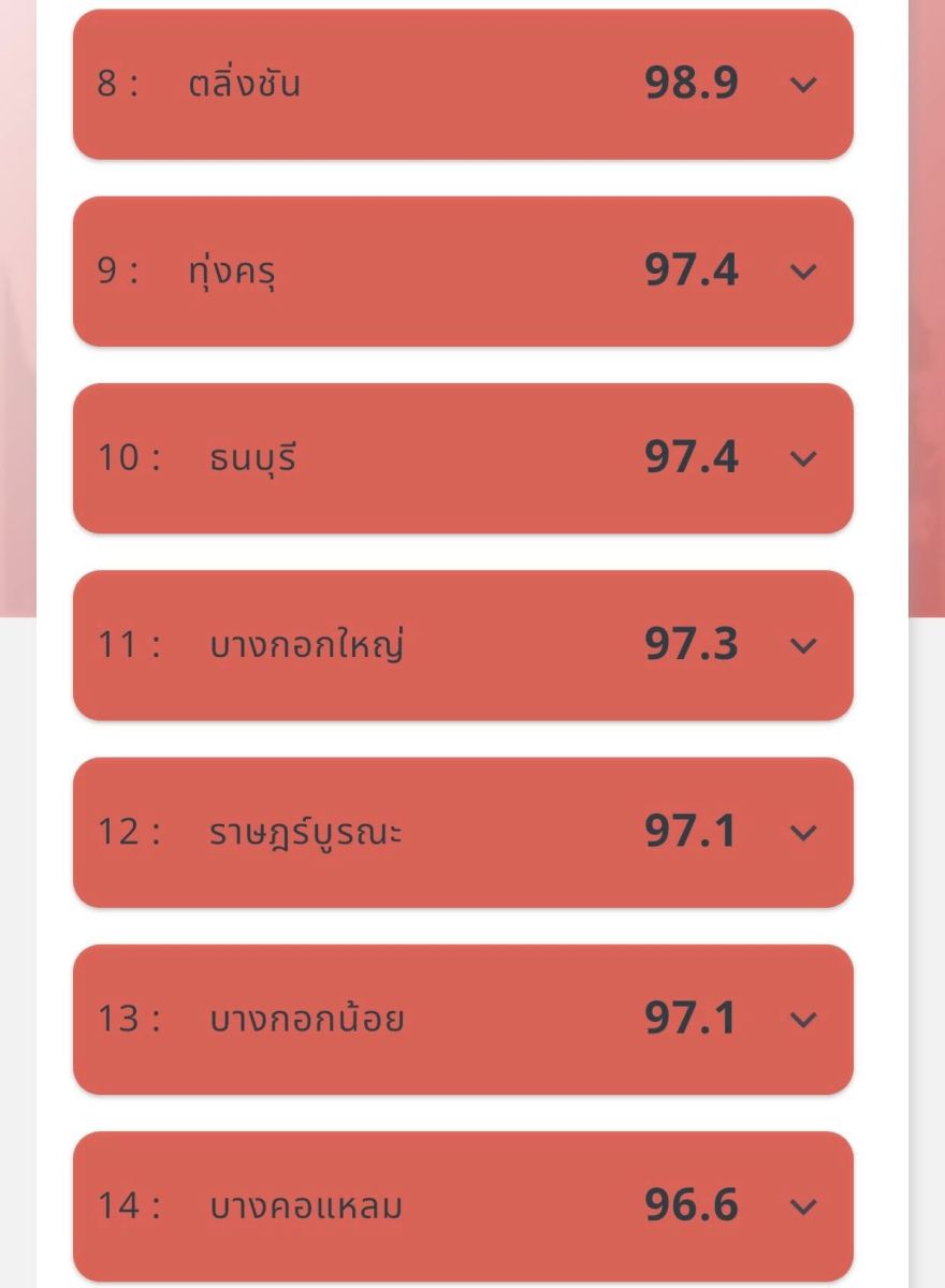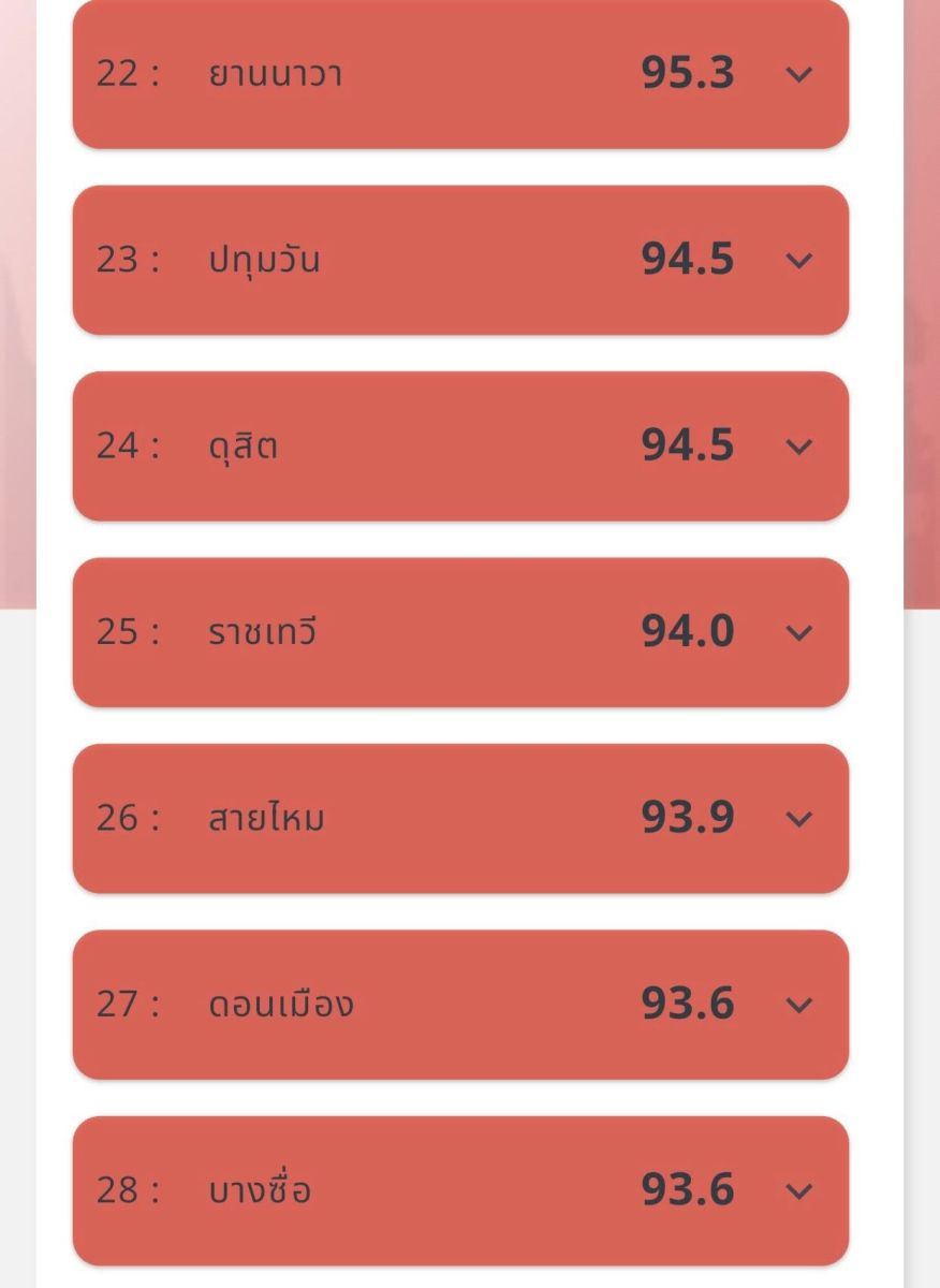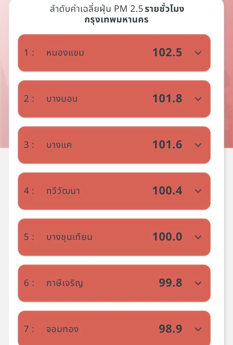 สำหรับ พื้นที่ กทม. เช้าวันนี้ พบว่าทุกเขตมีค่าฝุ่น PM2.5 เกินมาตรฐานระดับสีแดง เช่น หนองแขม บางบอน บางแค ทวีวัฒนา บางขุนเทียน ภาษีเจริญ จอมทอง ตลิ่งชัน ทุ่งครุ ธนบุรี บางกอกใหญ่ ราษฎร์บูรณะ บางกอกน้อย บางคอแหลม คลองสาน เป็นต้น