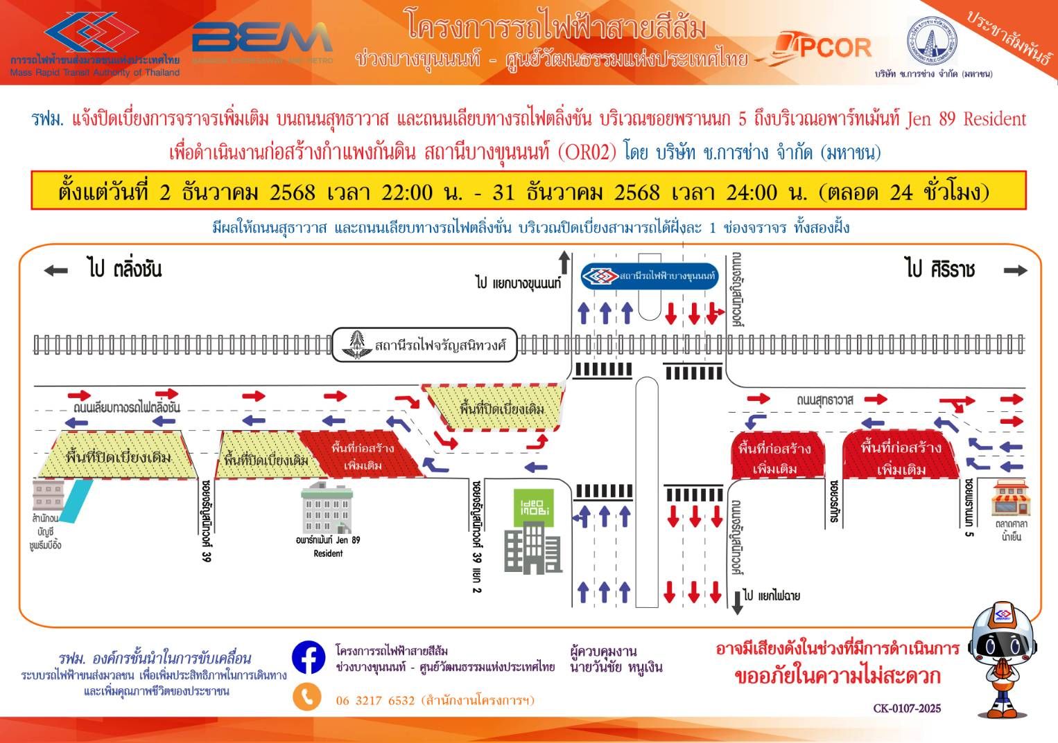 รฟม. แจ้งปิดเบี่ยงการจราจรเพิ่มเติม บนถนนสุทธาวาส และถนนเลียบทางรถไฟตลิ่งชัน เพื่อดำเนินงานรื้อย้ายสาธารณูปโภค และก่อสร้างกำแพงกันดิน สถานีบางขุนนนท์ (OR02) โครงการรถไฟฟ้าสายสีส้ม ช่วงบางขุนนนท์ - ศูนย์วัฒนธรรมแห่งประเทศไทย ตั้งแต่วันที่ 2 ธันวาคม 2568 เวลา 22:00 น. – 31 ธันวาคม 2568 เวลา 24:00 น. (ตลอด 24 ชั่วโมง) โดย ปิดเบี่ยงการจราจรเพิ่มเติม 2 ช่องจราจร บนถนนสุทธาวาส และถนนเลียบทางรถไฟตลิ่งชัน บริเวณซอยพรานนก 5 ถึงบริเวณอพาร์ทเม้นท์ Jen 89 Resident