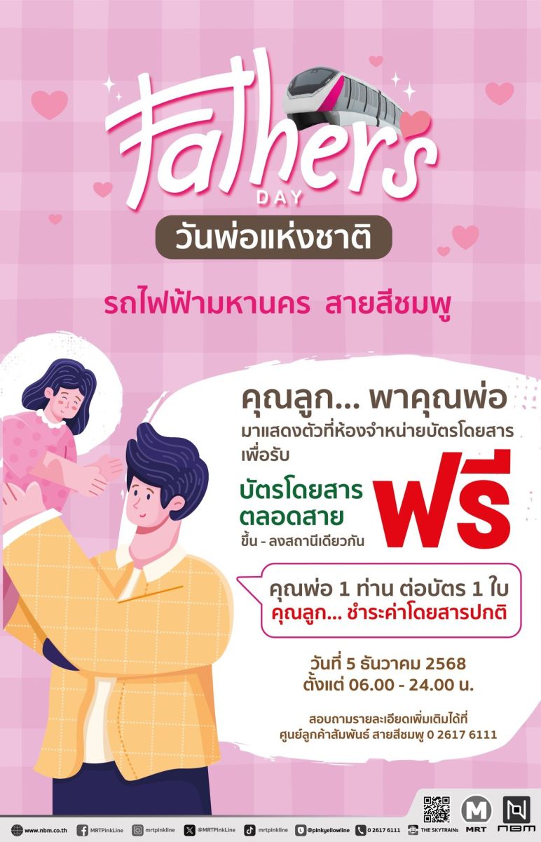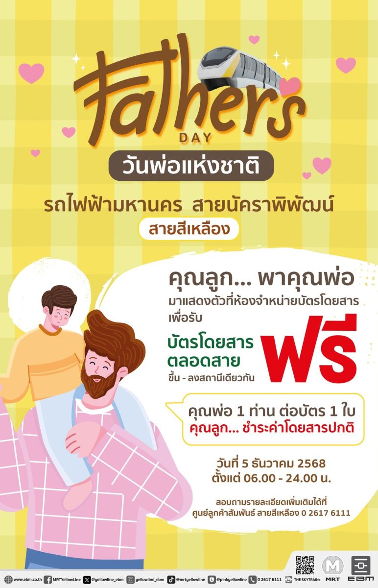 จัดกิจกรรมพิเศษยกเว้นค่าโดยสารรถไฟฟ้า MRT ทั้ง 4 สาย สำหรับคุณพ่อที่เดินทางพร้อมลูกในวันที่ 5 ธันวาคม 2568 เพียงคุณพ่อแสดงตัวที่ห้องออกบัตรโดยสารเพื่อรับคูปองหรือบัตรโดยสารรถไฟฟ้าฟรี ได้ทุกสถานี ตลอดระยะเวลาการเปิดให้บริการ โดยลูกชำระค่าโดยสารปกติ ทั้งนี้ เพื่อเป็นการอำนวยความสะดวกและส่งเสริมการเดินทางท่องเที่ยวสถานที่ ต่างๆ รอบเส้นทางรถไฟฟ้า MRT ตลอดจนเป็นการส่งเสริมสร้างความผูกพันในสถาบันครอบครัว