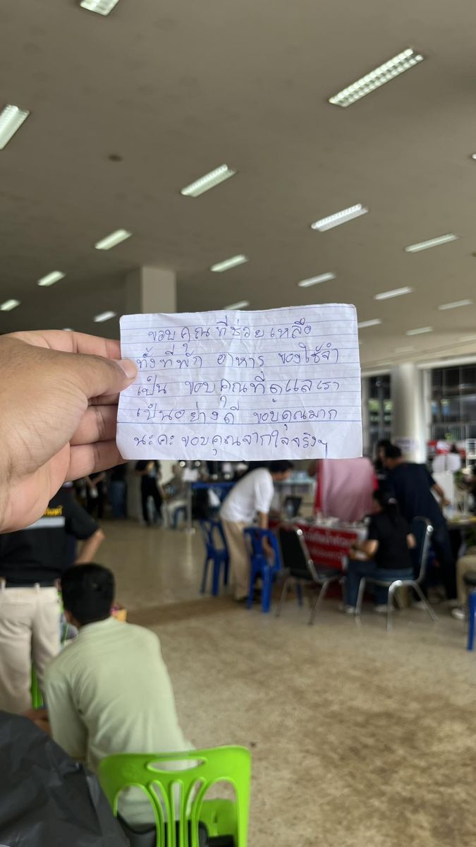 วันนี้ มีเรื่องประทับจะมาเล่า มีผู้อพยพคนหนึ่งกำลังจะกลับบ้าน แกเห็นจิตอาสากำลังทำงานอยู่ เลยเดินนำกระดาษใบหนึ่งให้จิตอาสาดู ในกระดาษมีข้อความว่า