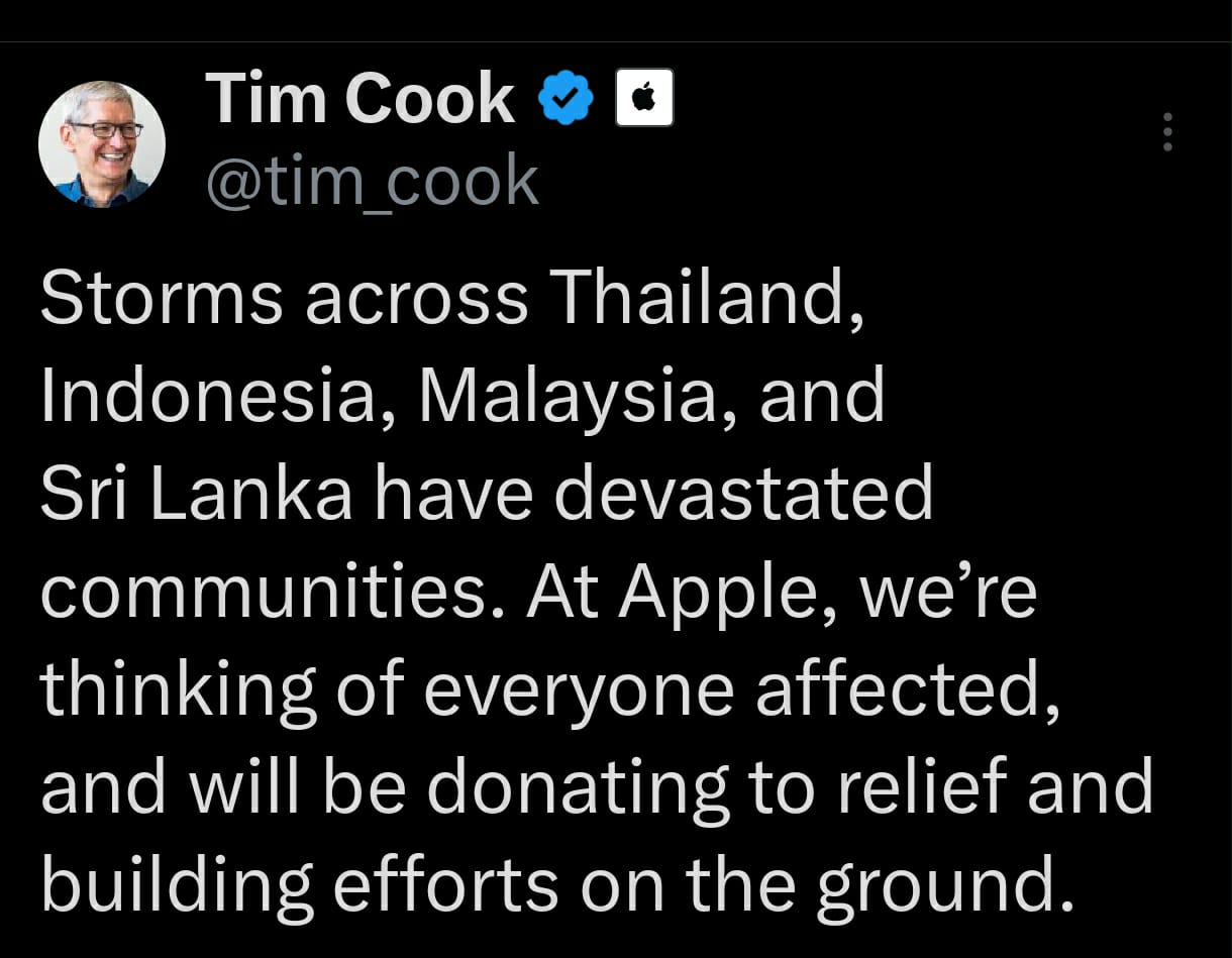 ขณะที่ล่าสุด ผู้สื่อข่าวรายงานว่า ทิม คุก (Tim Cook) ซีอีโอ Apple ได้โพสต์ข้อความในโซเชียลมีเดียส่วนตัวระบุว่า "มีพายุเกิดขึ้นทั่วประเทศไทย อินโดนีเซีย มาเลเซีย และศรีลังกา ซึ่งก่อให้เกิดความเสียหายกับชุมชน บ้านเรือนต่าง ๆ และทาง Apple ก็ขอแสดงความเสียใจกับผู้คนที่ได้รับผลกระทบทุกท่าน และยืนยันว่าจะดำเนินการบริจาคเงิน เพื่อช่วยเหลือในการบรรเทาทุกข์ รวมถึงสนับสนุนความพยายามในการฟื้นฟูและสร้างสิ่งปลูกสร้างต่าง ๆ ในพื้นที่ที่ได้รับความเสียหายให้กลับคืนมาด้วย"