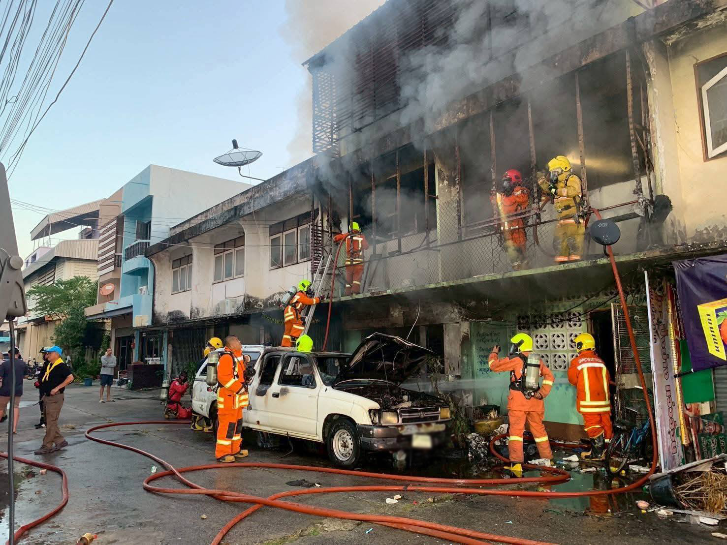 ที่เกิดเหตุ ลักษณะเป็นห้องแถว 3 ชั้นที่ปลูกติดกัน พบว่าเพลิงกำลังลุกไหม้ทั้งหลังและมีคนติดอยู่ในบ้าน ทางเจ้าหน้าที่กู้ภัยพร้อมเจ้าหน้าที่ดับเพลิงใช้เวลา 4 ชั่วโมง จึงควบคุมเพลิงได้ในวงจำกัด และหลังจากเพลิงสงบลง ชุกปฎิบัติการภายในอาคารจึงเข้าไปตรวจสอบ พบร่างของผู้เสียชีวิตภายในบ้านบริเวณชั้นสอง สภาพถูกไฟคลอกร่าง ตรวจสอบทราบต่อมา เป็นชายไทย อายุประมาณ 50 ปี