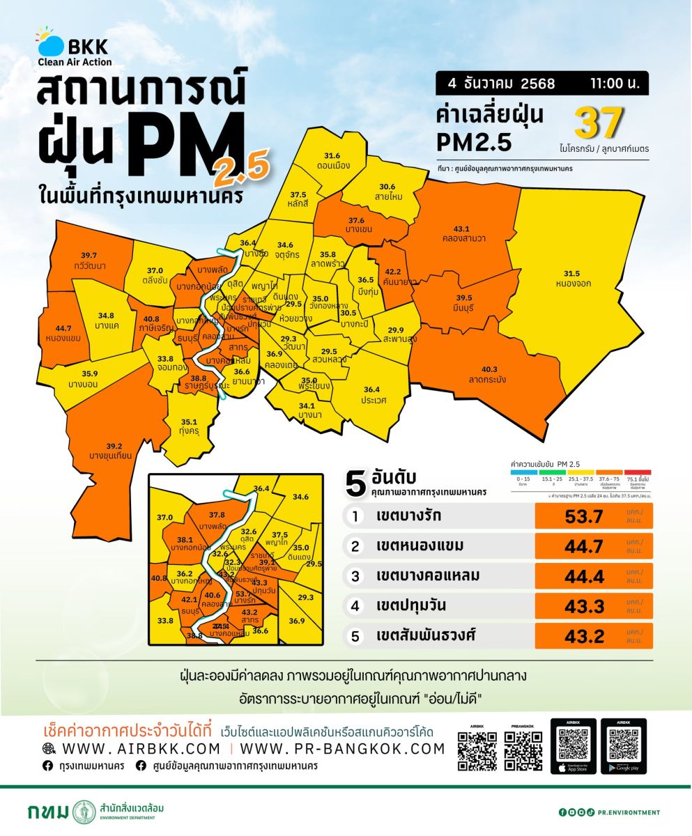 ศูนย์ข้อมูลคุณภาพอากาศกรุงเทพมหานคร ขอรายงานสถานการณ์ฝุ่นละอองขนาดไม่เกิน 2.5 ไมครอน (PM 2.5) ในกรุงเทพมหานคร ประจำวันที่ 4 ธันวาคม 2568 เวลา 11:00 น.