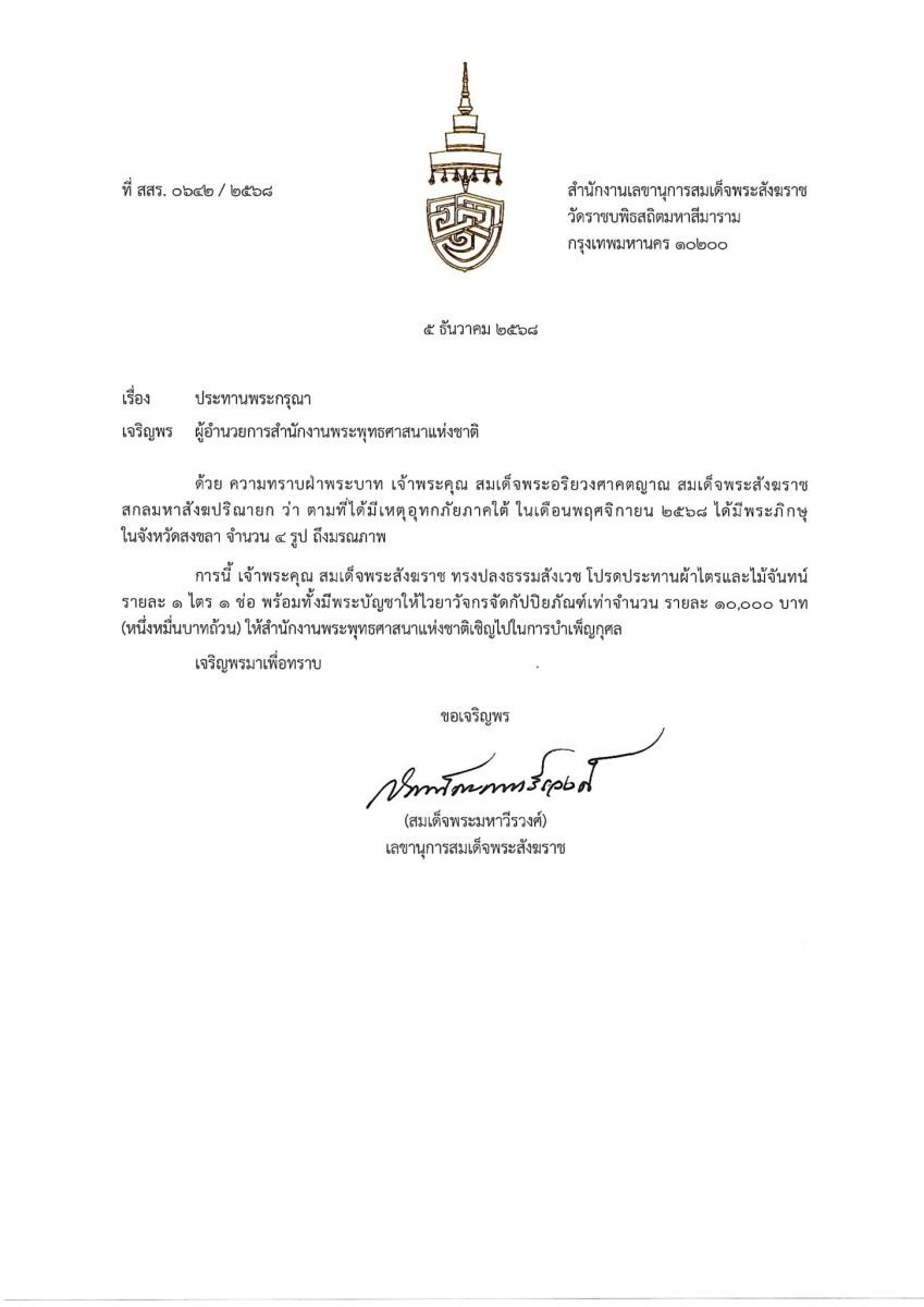 สมเด็จพระสังฆราชฯ ประทานผ้าไตร ไม้จันทน์ และกัปปิยภัณฑ์ แก่พระภิกษุในจังหวัดสงขลา ซึ่งถึงมรณภาพจากเหตุอุทกภัย