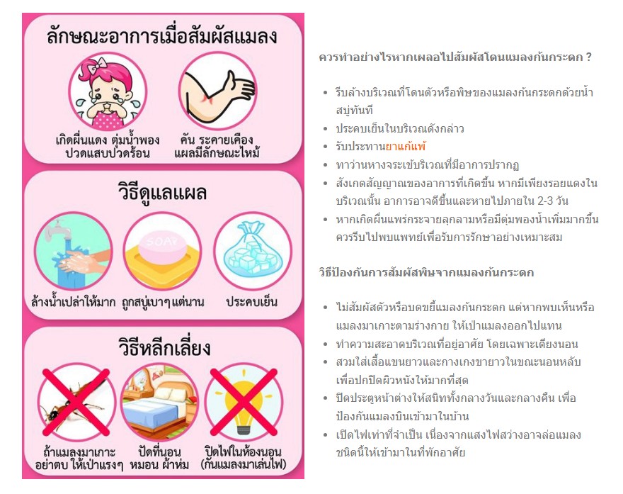 นายแพทย์ปุณวิศ สุทธิกุลณเศรษฐ์ นายแพทย์ชำนาญการพิเศษ สถาบันโรคผิวหนัง กล่าวว่า อาการส่วนใหญ่ไม่รุนแรง และมักดีขึ้นภายใน 1–2 สัปดาห์ แต่อาจทิ้งรอยดำหรือแผลเป็นได้ โดยเฉพาะหากมีการติดเชื้อแทรกซ้อนจากการเกาคำแนะนำในการดูแลเบื้องต้น1. หากสัมผัสแมลงหรือมีอาการผิดปกติบนผิวหนัง ควร รีบล้างบริเวณที่สงสัยด้วยน้ำสะอาดและสบู่อ่อน 2. ทายาลดการอักเสบกลุ่มสเตียรอยด์ปานกลางถึงสูง เพื่อลดอาการแสบร้อน และอยู่ภายใต้การดูแลของแพทย์ผู้เขี่ยวชาญ 3. หากมีตุ่มหนอง แผลบวมแดงมาก หรือเป็นบริเวณใบหน้า ควรรีบพบแพทย์ผู้เชี่ยวชาญ