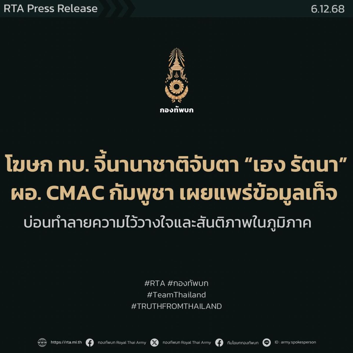 วันที่ 6 ธันวาคม 2568 เพจ กองทัพบก Royal Thai Army โพสต์ข้อความระบุ จากกรณีที่ เมื่อวันที่ 5 ธันวาคม 2568 นายเฮง รัตนา ผอ. CMAC กัมพูชา เผยแพร่ข้อความระบุว่า วันนี้ตนและทีมงานอยู่ระหว่างติดตั้งซากระเบิด MK84 ที่นำมาจัดแสดงภายในอาคารรูปทรง PMN-2 เพื่อเป็นสัญลักษณ์แสดงถึงความมุ่งมั่นและผลสำเร็จที่ได้รับการยอมรับของกัมพูชาในการปฏิบัติตามอนุสัญญาออตตาวา รวมถึงกล่าวหาว่า ไทยพยายามเบี่ยงเบนความสนใจของนานาชาติจาก “การรุกรานและยึดครองดินแดนกัมพูชา” โดยกล่าวโทษว่าฝ่ายกัมพูชาวางทุ่นระเบิดใหม่จนทำให้ทหารไทยเสียชีวิต และใช้ถ้อยคำเปรียบไทยว่าเป็น “โจรที่กลับฟ้องเจ้าของที่ดิน” พร้อมอ้างว่า หากไทยไม่ “บุกเข้ามายึดครองพื้นที่ของกัมพูชา” ก็จะไม่เกิดเหตุใด ๆ กับกำลังพลไทยนั้น