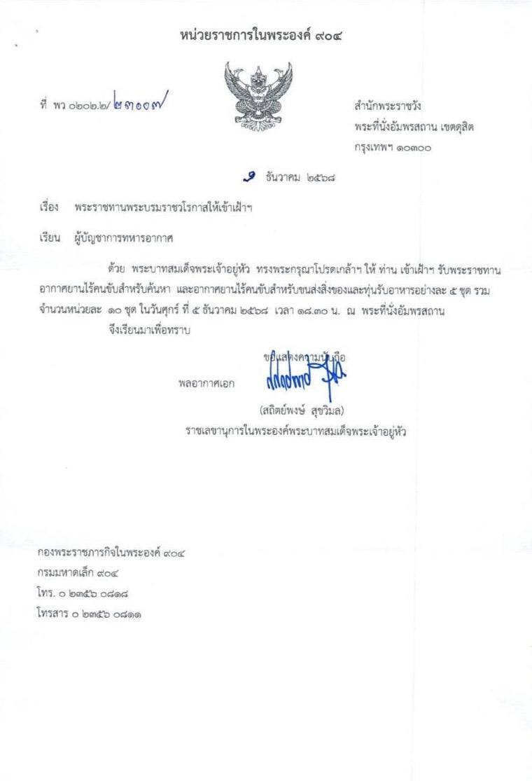 ในการนี้ พลอากาศเอก เสกสรร คันธา ผู้บัญชาการทหารอากาศ เฝ้าทูลละอองธุลีพระบาท รับพระราชทานอากาศยานไร้คนขับ (Drone) จำนวน 10 ชุด แบ่งเป็น อากาศยานไร้คนขับสำหรับค้นหา จำนวน 5 ชุด และอากาศยานไร้คนขับสำหรับขนส่งอาหาร จำนวน 5 ชุด เพื่อนำไปช่วยเหลือผู้ประสบอุทกภัยในพื้นที่จังหวัดสงขลา และจังหวัดอื่น ๆ ในพื้นที่ภาคใต้ต่อไป