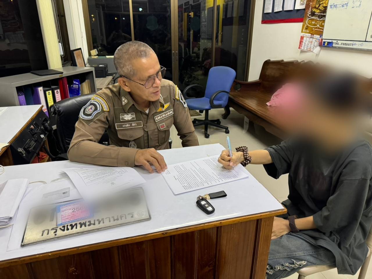 โดย เมื่อวันที่ 19 ธันวาคม 2567 เวลา 09.49 น. ผู้ร้องทุกข์ยืนยันว่า ไม่เคยนำรถไปกระทำความผิดในพื้นที่ดังกล่าว และคาดว่ารถถูก สวมทะเบียน จึงได้แจ้งความลงบันทึกประจำวันไว้เป็นหลักฐาน ณ สถานีตำรวจภูธรเมืองสมุทรปราการ และมีการแจ้งเรื่ิองที่ถูกสวมทะเบียนเข้ามาที่ สถานีตำรวจทางหลวง 1 กองกำกับการ 1 จึงได้ สืบสวนติดตามผู้กระทำความผิด ต่อมา เจ้าหน้าที่ตำรวจทางหลวงได้ออกตรวจพื้นที่ตามวันเวลาและสถานที่เกิดเหตุ พบรถยนต์นั่งส่วนบุคคลยี่ห้อ BMW รุ่น X5 สีขาว ทะเบียน กทม. โดยมีผู้ขับขี่เป็นหญิงรายหนึ่ง เจ้าหน้าที่ได้ตรวจสอบหมายเลขตัวถังของรถคันดังกล่าว และพบว่าข้อมูลที่ปรากฏไม่ตรงกับแผ่นป้ายแสดงการเสียภาษีประจำปีและมีความเกี่ยวข้องกับหมายเลขทะเบียนอื่นจากการสอบถาม ผู้ขับขี่ให้การว่า ได้รับรถยนต์คันดังกล่าว