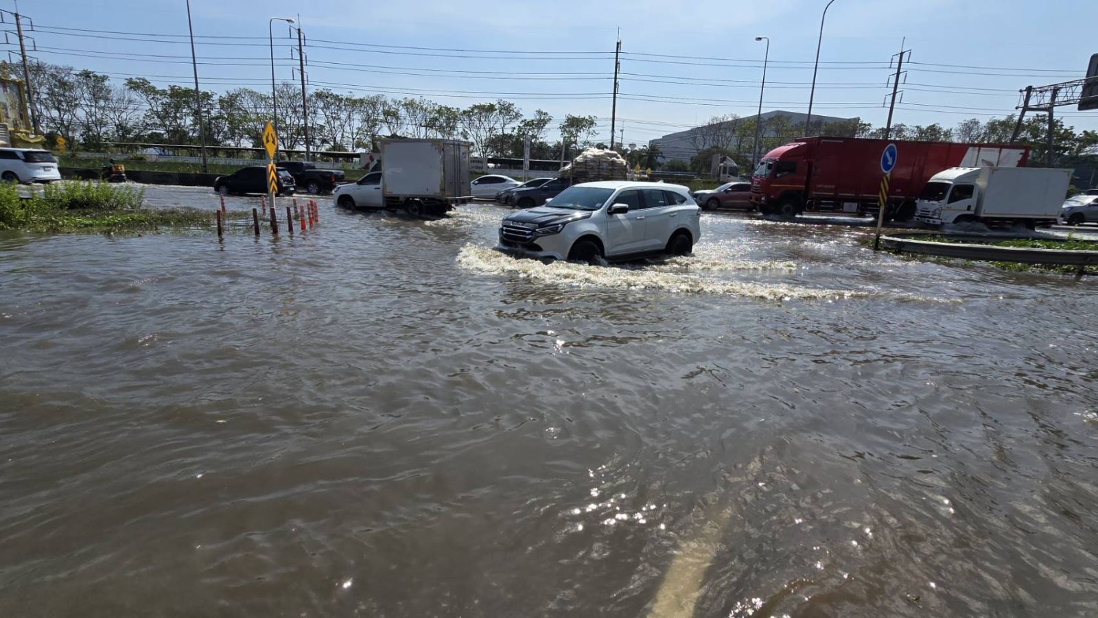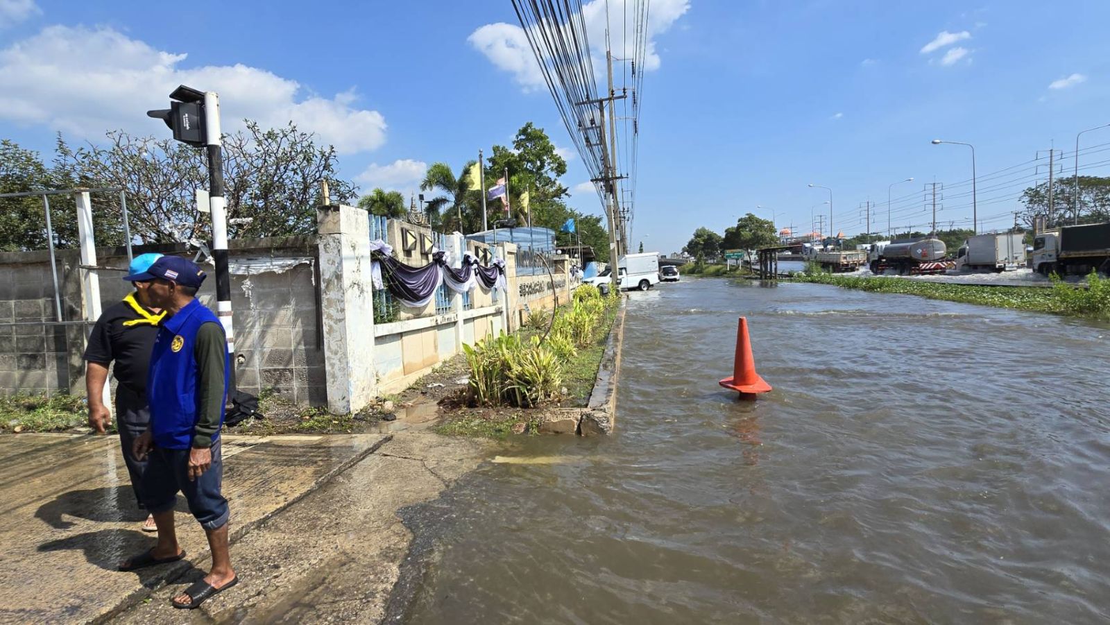 12.26 น. ถนนพระราม 2 ฝั่งขาเข้า เชิงทางขึ้นสะพานข้ามคลองตาขำ และจุดกลับรถ น้ำเริ่มไหลเข้าท่วมผิวการจราจรแล้ว ทุกช่องทาง ส่วนหน้าดูโฮม มหาชัย ยังผ่านได้ #รายงานจราจร #น้ำทะเลหนุน #พระรามสอง #FM91