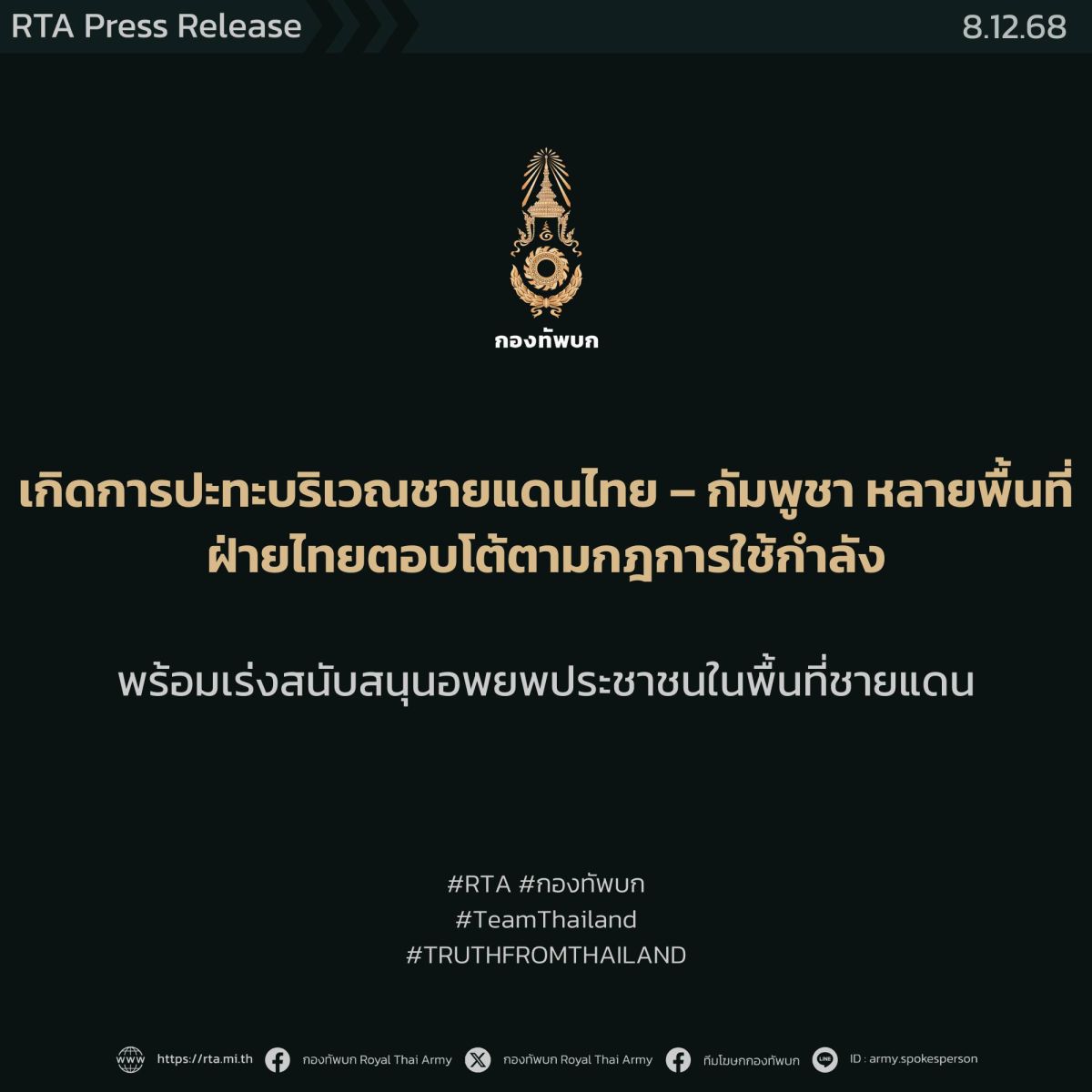 โดยมีเหตุการณ์ที่สำคัญ ตั้งแต่ช่วงกลางดึกที่ผ่านมาจนถึงในช่วงเช้าวันนี้ ที่ทหารกัมพูชาได้ใช้อาวุธยิงสนับสนุนโจมตีต่อกำลังทหารไทยในพื้นที่ช่องบก อ.น้ำยืน จ.อุบลราชธานี และพื้นที่อื่นๆ จนทำให้กำลังพล เสียชีวิต 1 นาย และได้รับบาดเจ็บ 8 นาย รวมทั้งการตรวจพบว่ากัมพูชาได้ใช้อาวุธจรวด BM21 โจมตีพื้นที่ชุมชนพลเรือน บ.สายโท 10 อ.บ้านกรวด จ.บุรีรัมย์ ซึ่งไม่ใช่พื้นที่ปฏิบัติการทางทหาร และหวังทำร้ายต่อชีวิตและทรัพย์สินของประชาชนชาวไทย