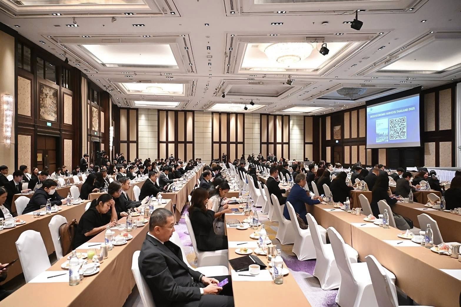 วันนี้ (8 ธันวาคม 2568) ณ โรงแรมแชงกรี-ลา กรุงเทพฯ นางสาวศุภมาส อิศรภักดี รัฐมนตรีประจำสำนักนายกรัฐมนตรี ได้รับมอบหมายจากนายเอกนิติ นิติทัณฑ์ประภาศ รองนายกรัฐมนตรีและรัฐมนตรีว่าการกระทรวงการคลัง เป็นประธานเปิดการเผยแพร่รายงาน “Economic Survey of Thailand 2025: Building the Foundations for Stronger Growth” จัดทำโดยองค์การเพื่อความร่วมมือและการพัฒนาทางเศรษฐกิจ หรือ OECD โดยมีผู้บริหาร OECD และสภาพัฒนาการเศรษฐกิจและสังคมแห่งชาติ เข้าร่วมในพิธีอย่างพร้อมเพรียง