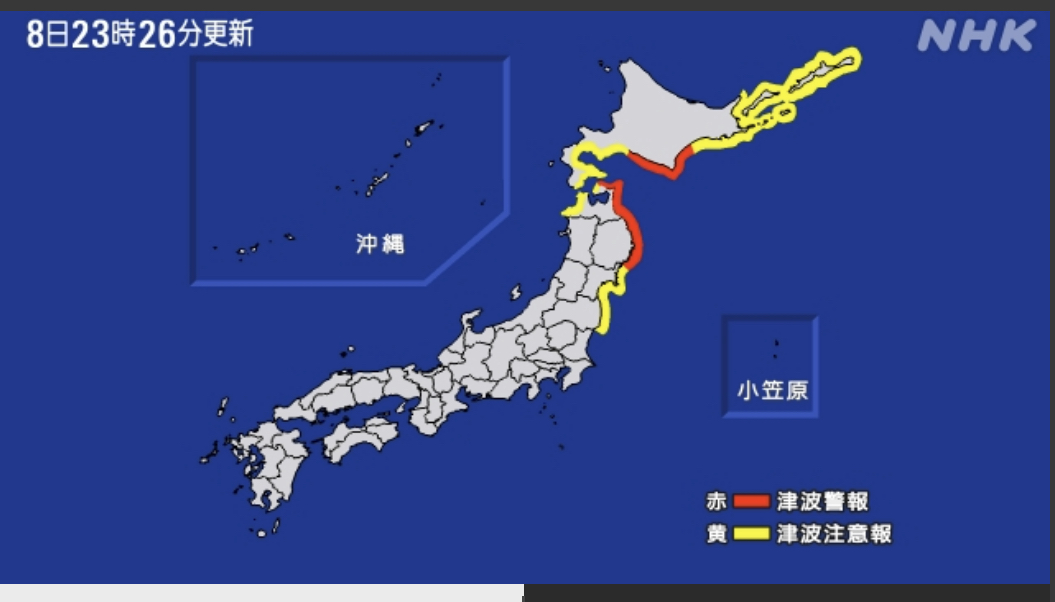 สถานเอกอัครราชทูต ณ กรุงโตเกียว เผย กรมอุตุฯ ญี่ปุ่น เตือนภัยคลื่นสึนามิ แถวชายฝั่ง จ.อาโอโมริ อิวาเตะ และฮอกไกโด คาดการณ์ว่าอาจมีคลื่นสึนามิสูงประมาณ 1 เมตร