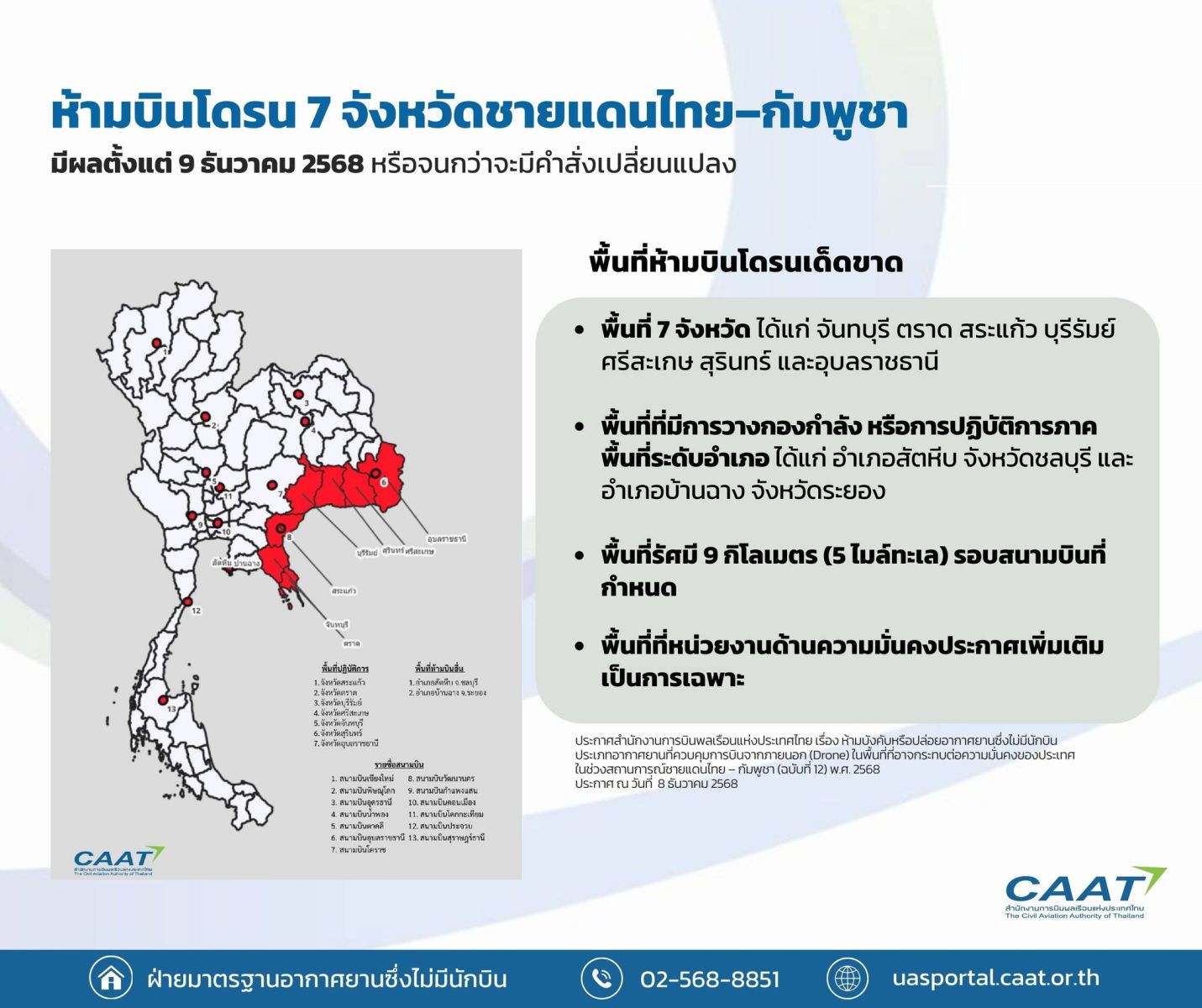 สำนักงานการบินพลเรือนแห่งประเทศไทย (กพท.) หรือ CAAT ออกประกาศฉบับที่ 12 เรื่อง “ห้ามบังคับหรือปล่อยอากาศยานซึ่งไม่มีนักบิน (Drone) ในพื้นที่ที่อาจกระทบต่อความมั่นคงของประเทศในช่วงสถานการณ์ชายแดนไทย–กัมพูชา” มีผลบังคับใช้ตั้งแต่ 9 ธันวาคม 2568 จนกว่าจะมีประกาศเปลี่ยนแปลง