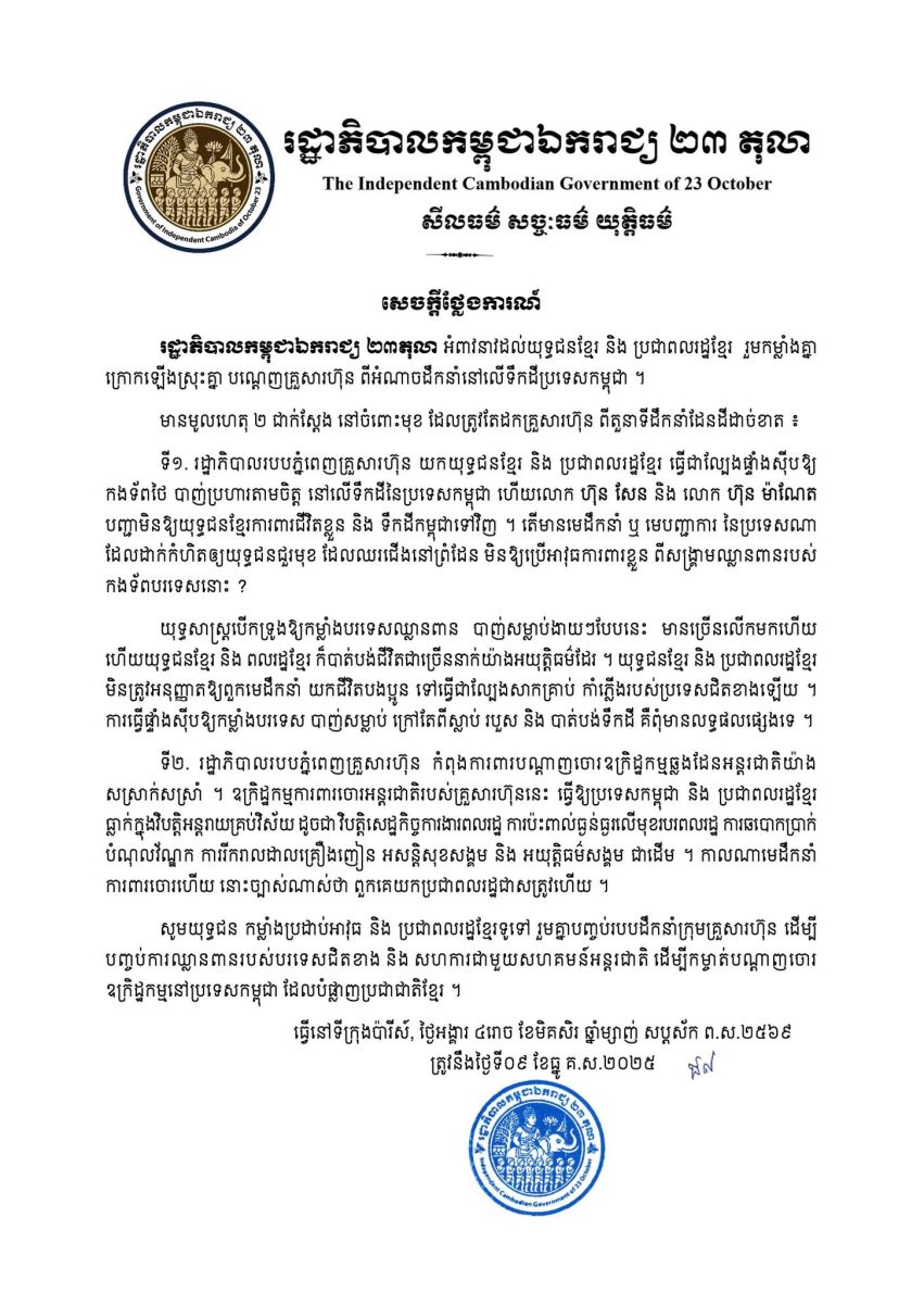 9 ธันวาคม 2568 สม รังสี อดีตผู้นำฝ่ายค้านของกัมพูชา โพสต์แถลงการณ์บนโซเชียลมีเดีย ในนาม รัฐบาลกัมพูชา 23 ตุลาคม เรียกร้องทหารและประชาชนลุกขึ้นขับไล่ "ตระกูลฮุน" ออกจากแผ่นดินกัมพูชา